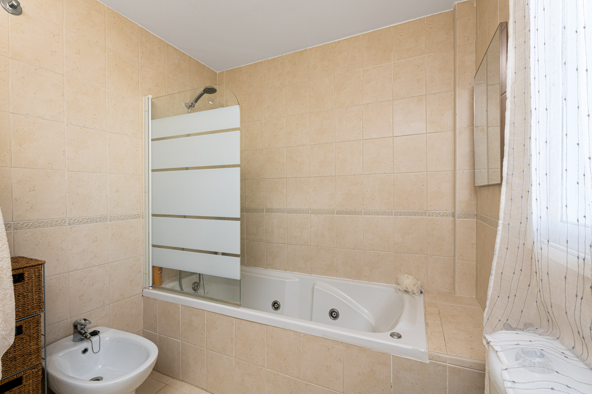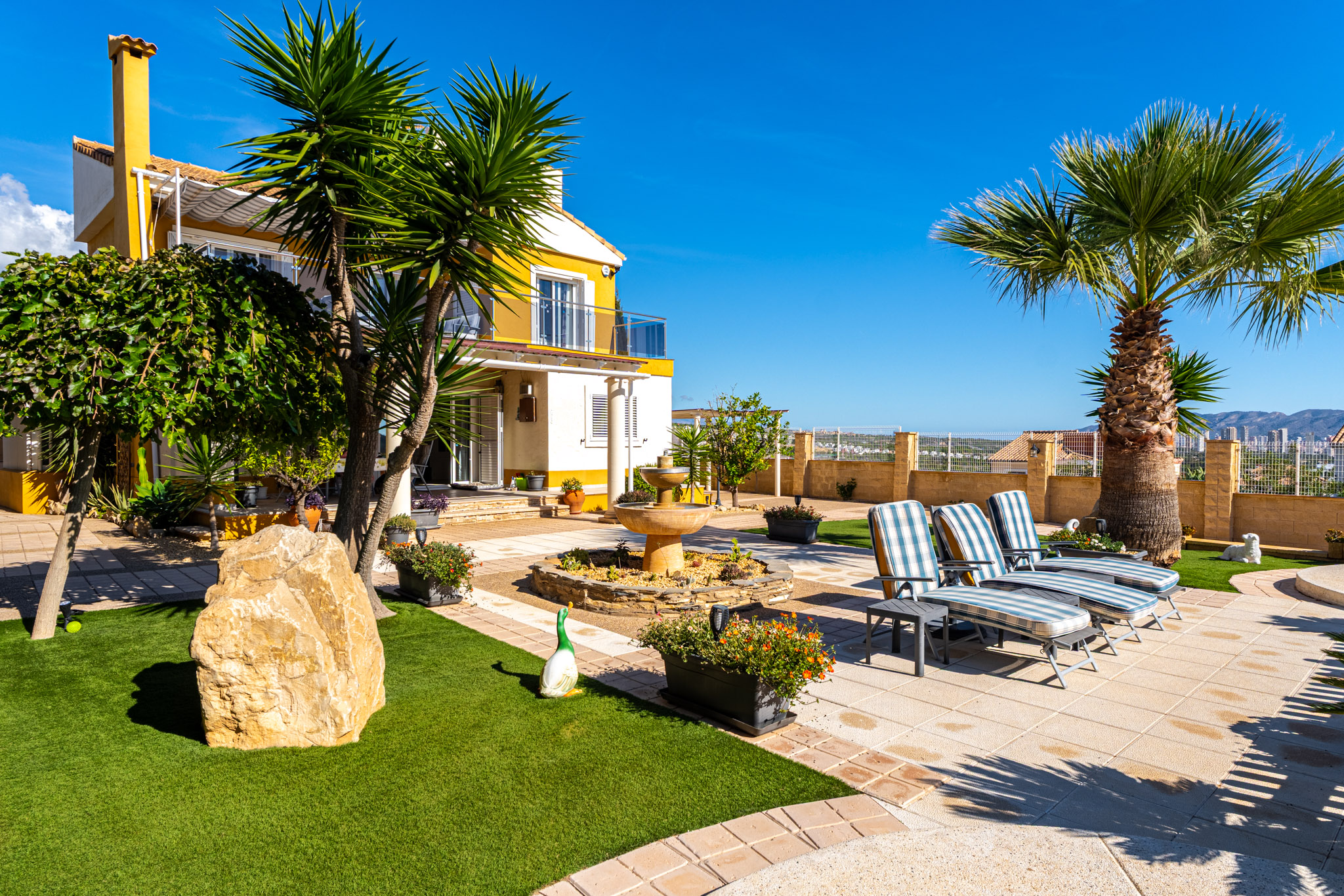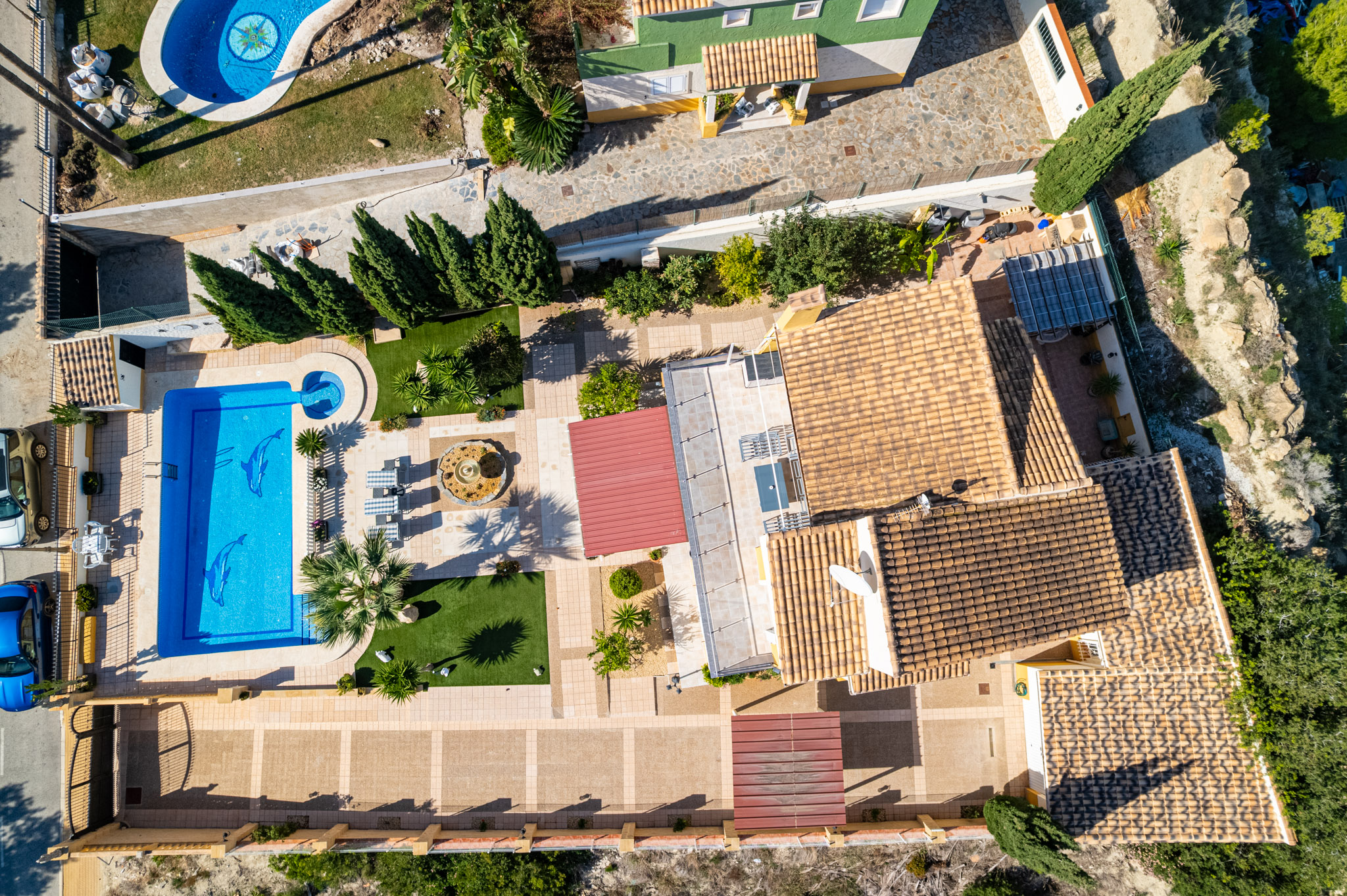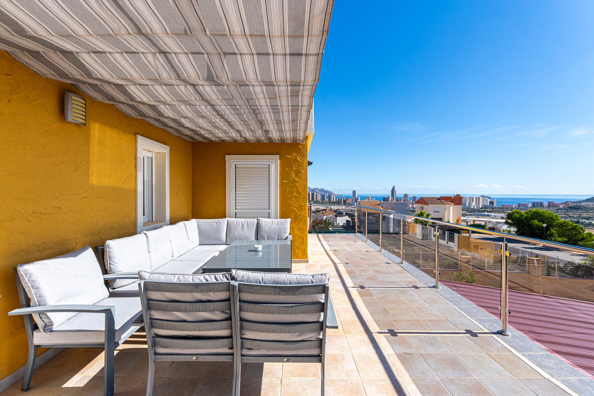 Upstairs, three additional bedrooms and the main family bathroom are located, with the master suite featuring an elegant ensuite bathroom with bathtub, WC, and double vanity unit. The master bedroom also has direct access to the upper terrace, shared with another double bedroom, from which you can enjoy breathtaking panoramic views of the Mediterranean Sea, the surrounding mountains, and the coastline stretching from Benidorm to Villajoyosa.