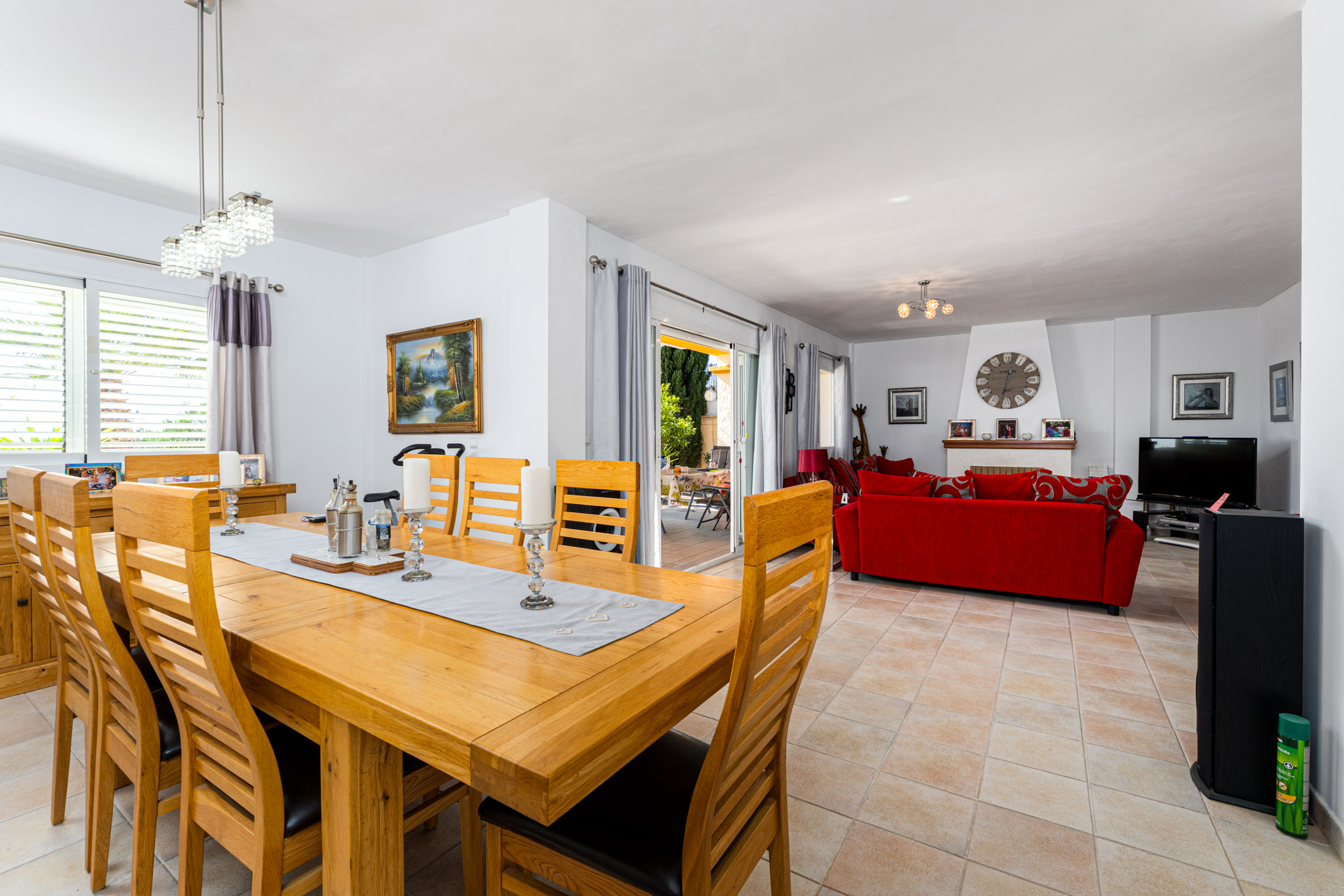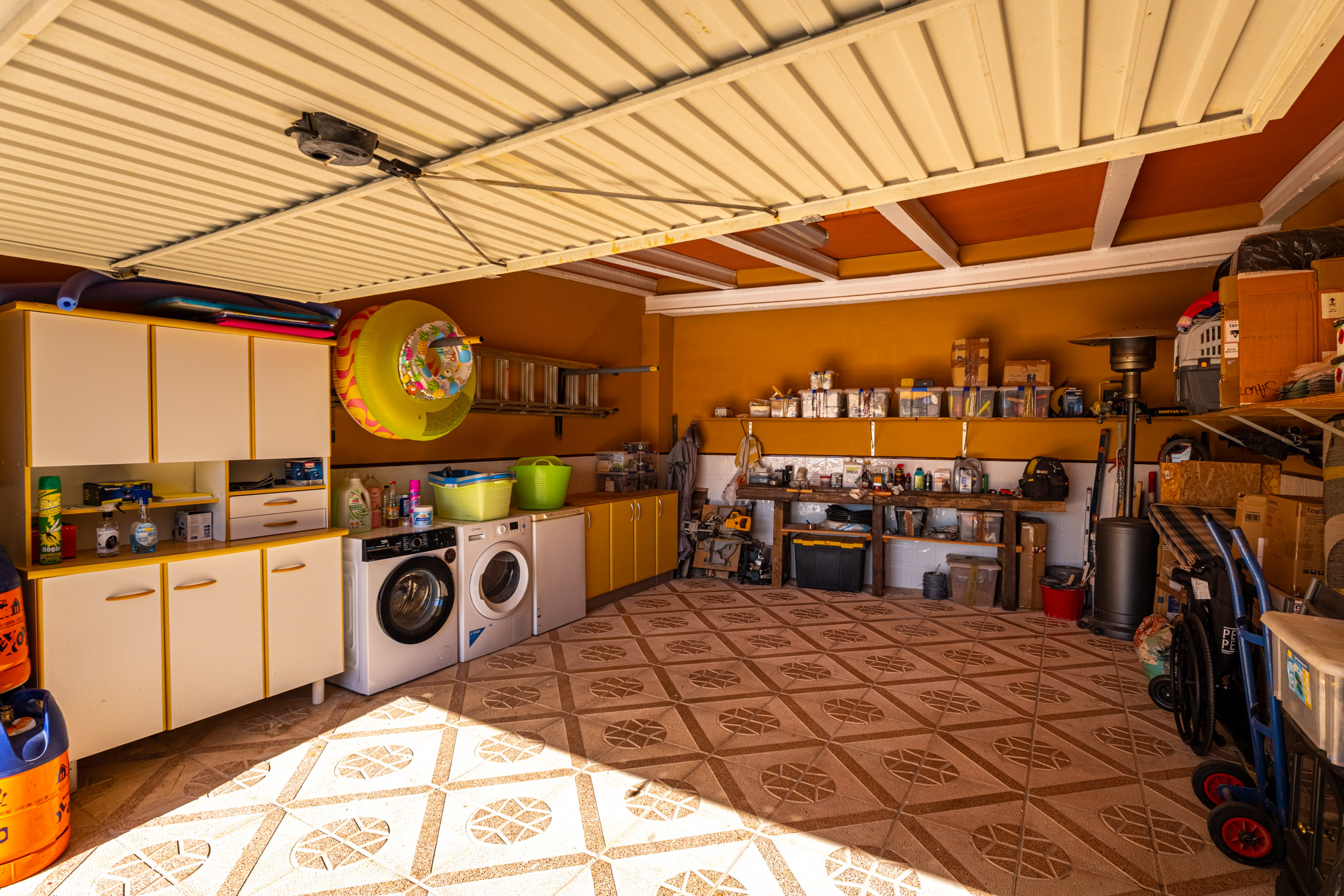 Upon entering the grounds, you are welcomed by a spacious driveway accommodating up to five or six vehicles, surrounded by meticulously maintained gardens and a private swimming pool with jacuzzi. The exterior spaces have been thoughtfully designed for elegant outdoor living, enjoying abundant sunlight throughout the day, with fruit trees, palm trees, and access to a private garage for two additional cars.