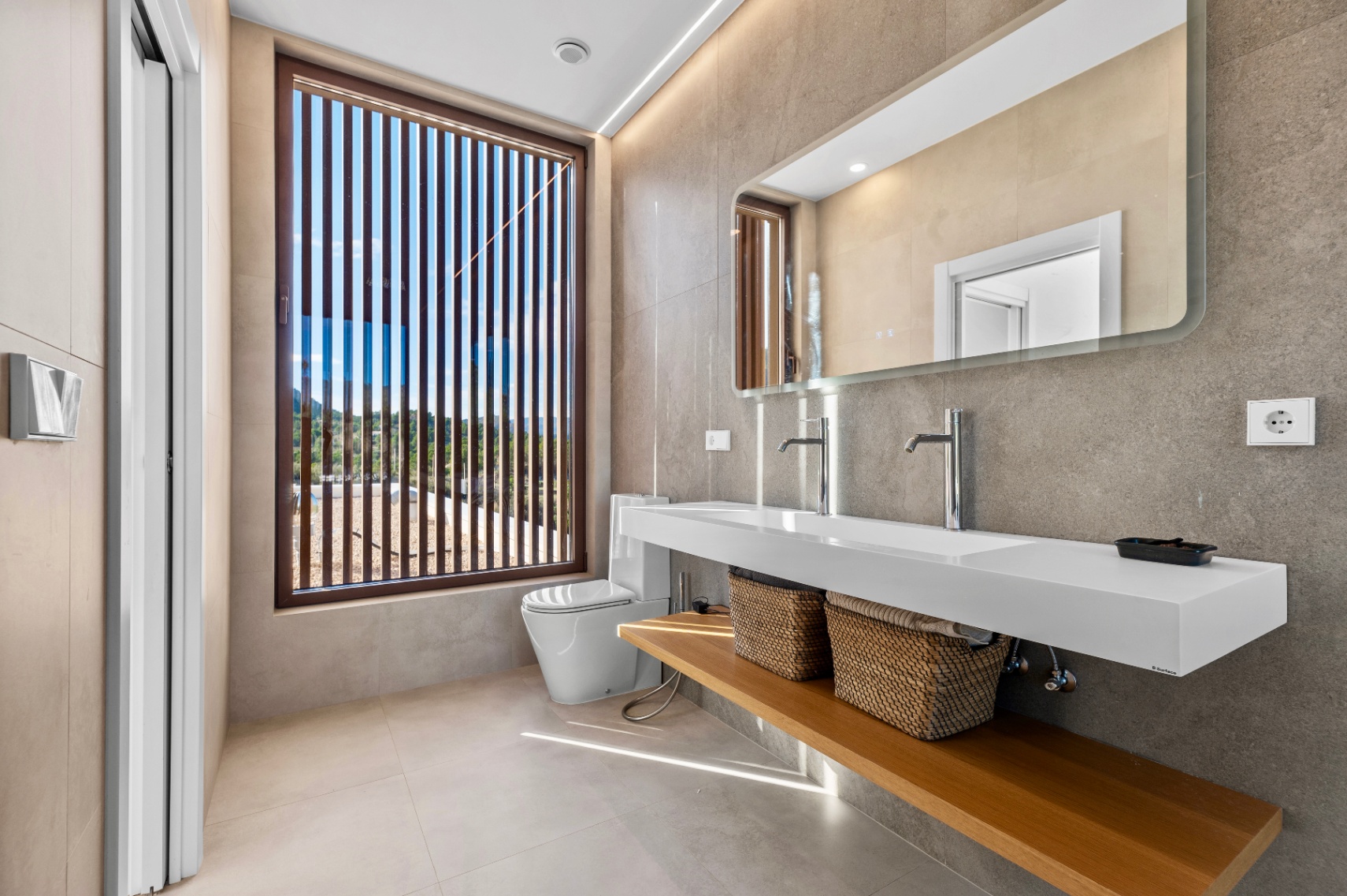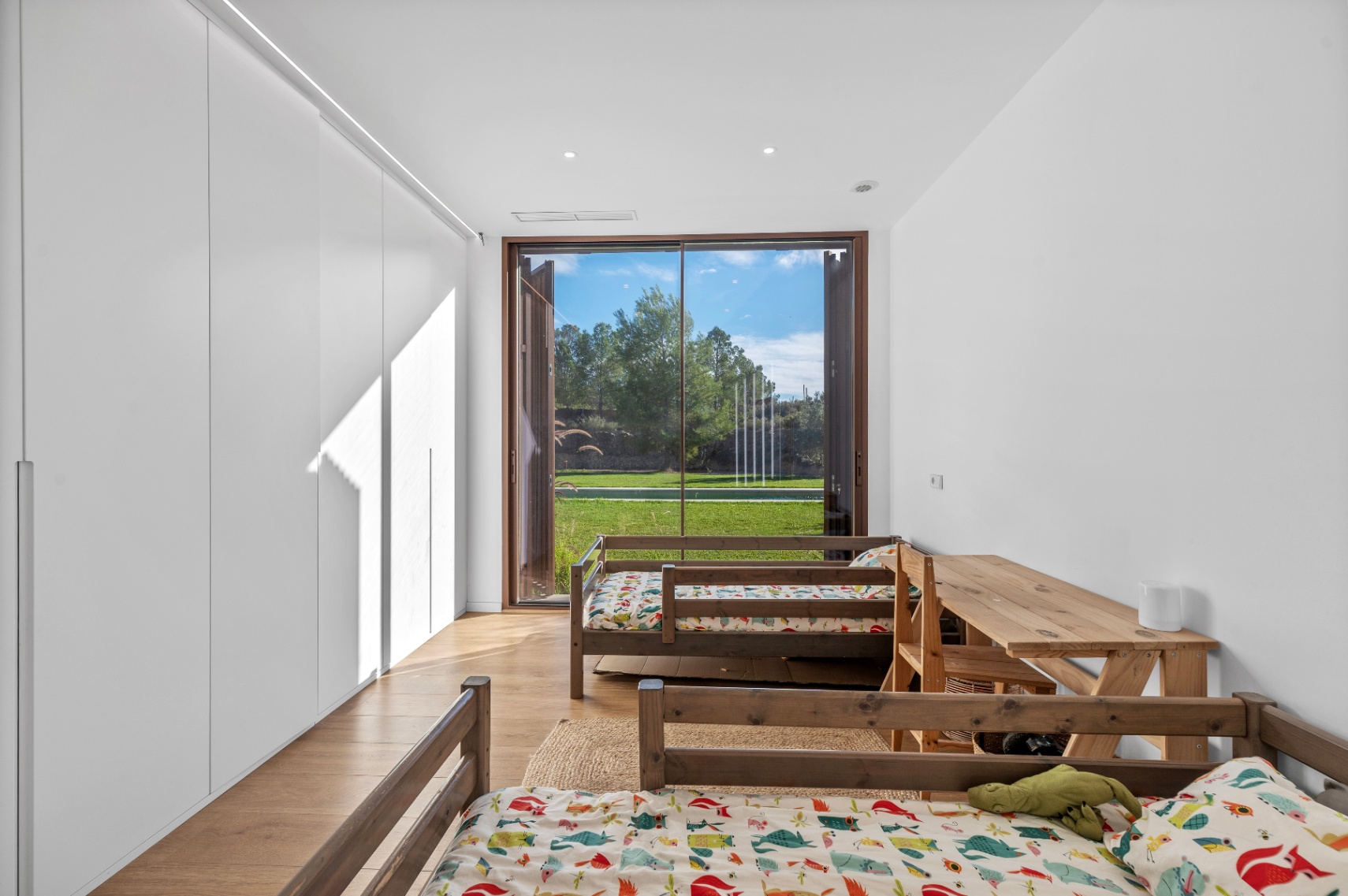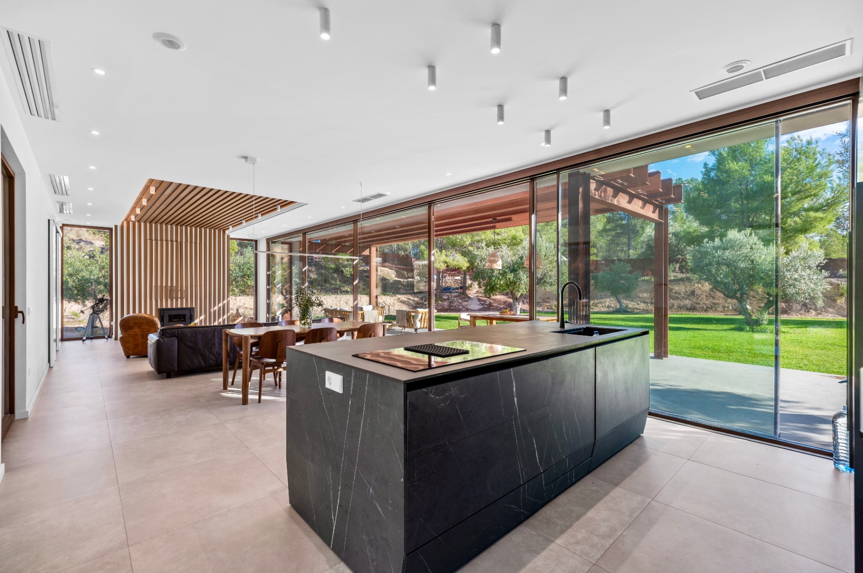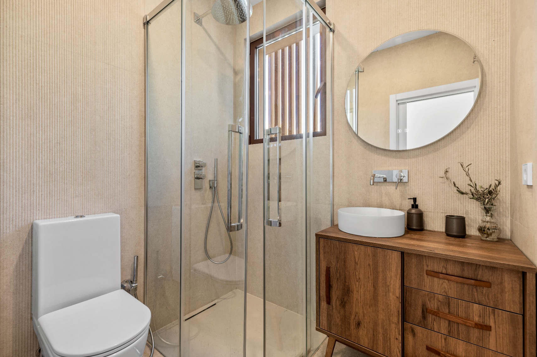 Villa offers four bedrooms and three bathrooms, all designed with comfort and modern functionality in mind. The bright, spacious interior is enhanced by large panoramic windows, creating a seamless connection between indoor and outdoor living. The Santos kitchen includes an island with full storage, high-end appliances, a carbon-filter range hood, and a Liebherr fridge-freezer. Bathrooms are equipped with stainless steel thermostatic taps and anti-fog LED mirrors.