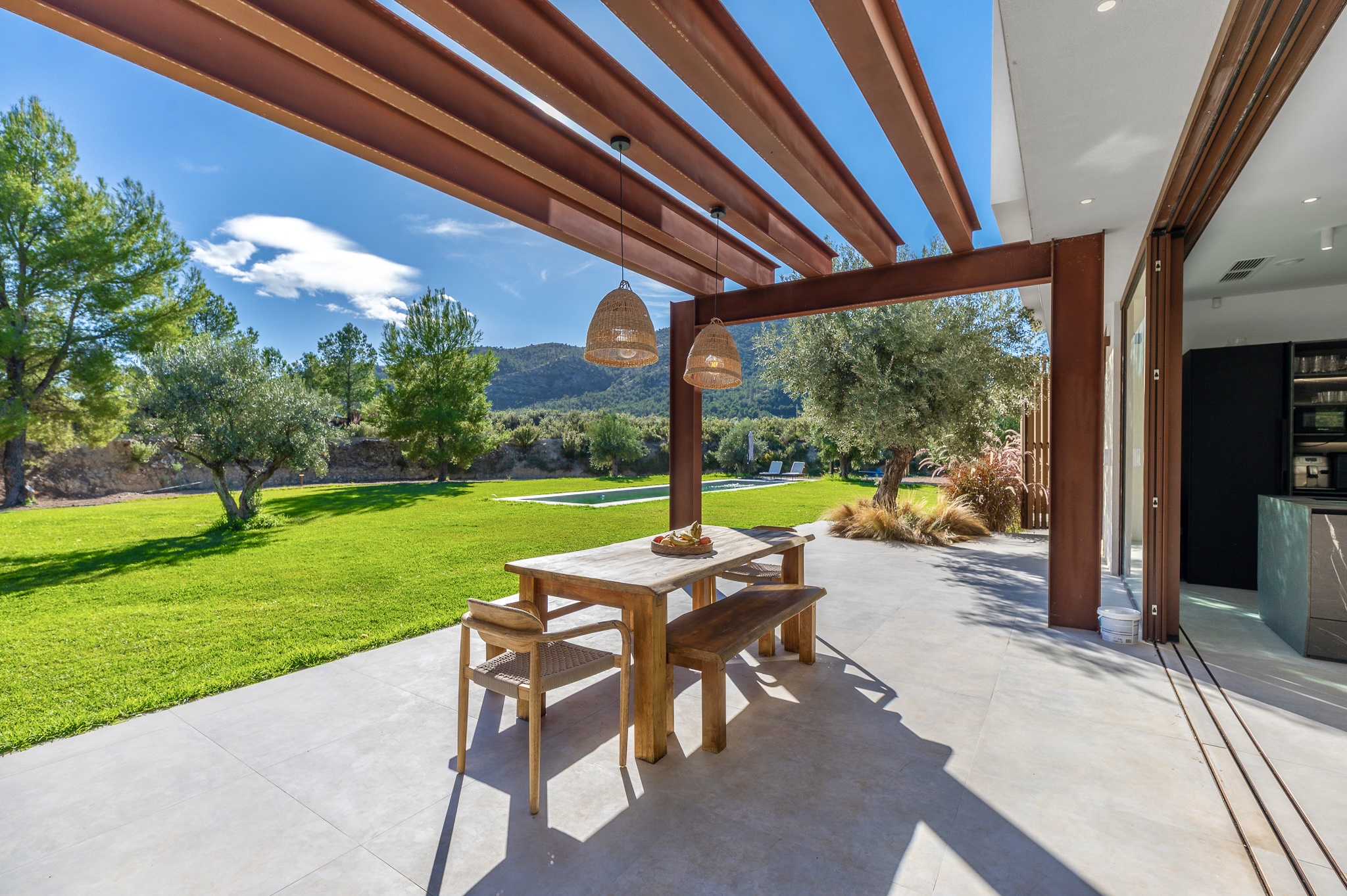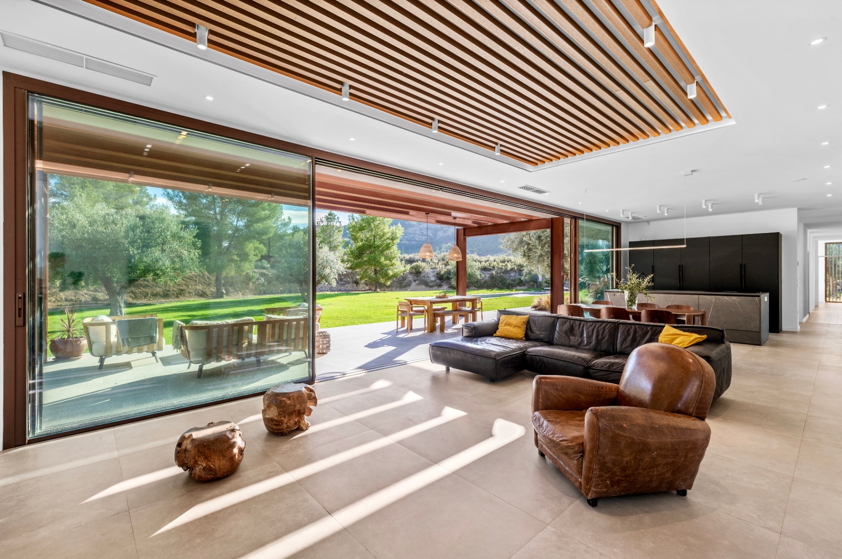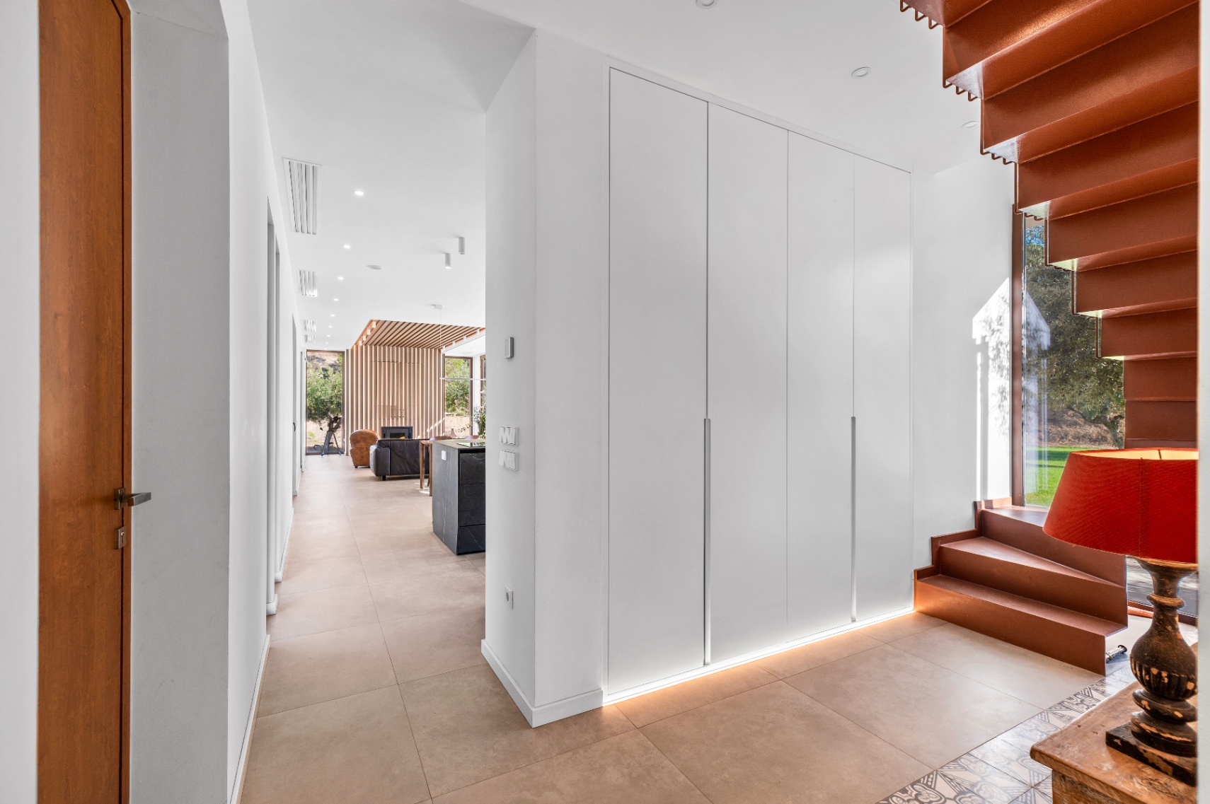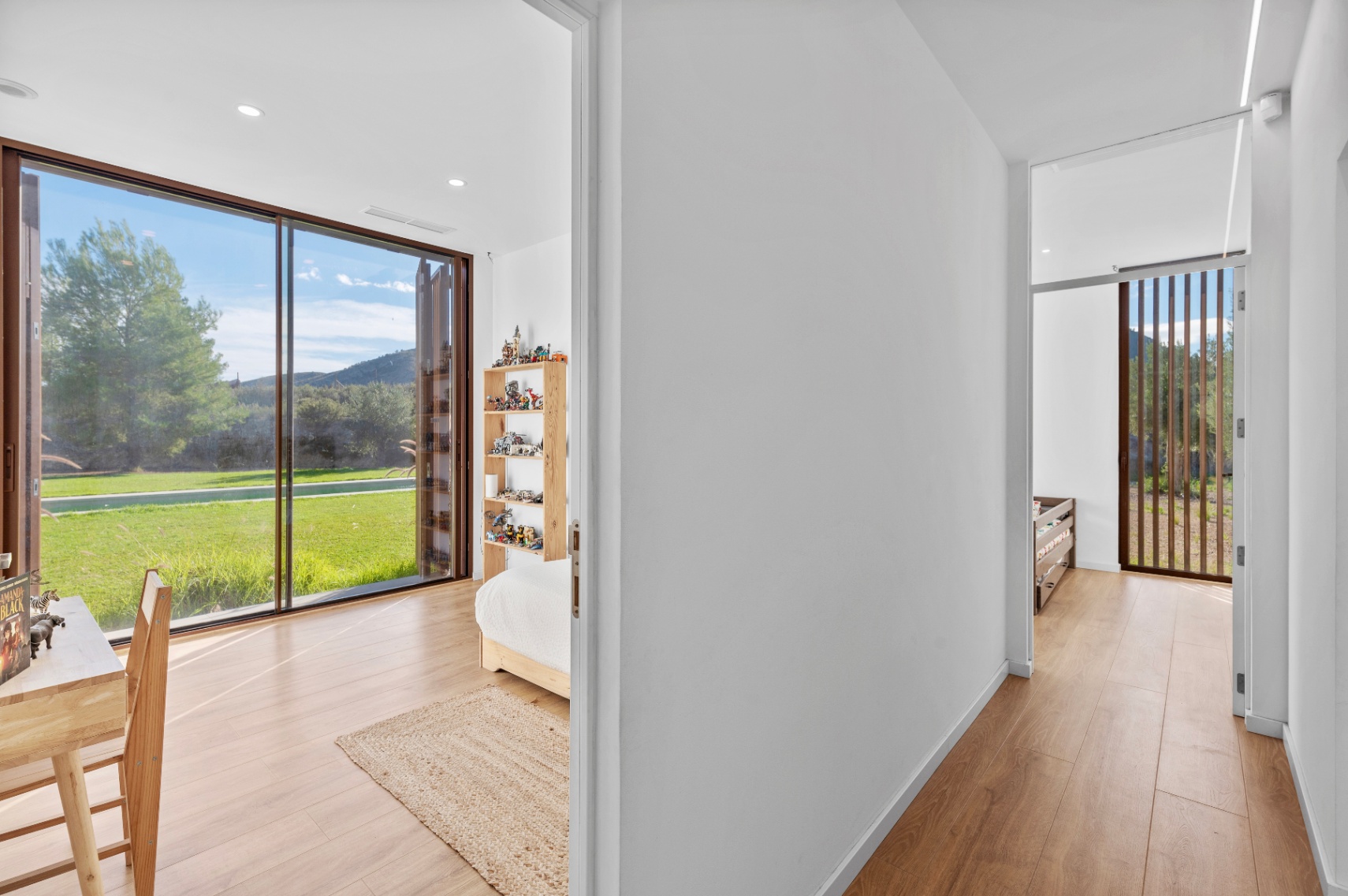 Villa offers four bedrooms and three bathrooms, all designed with comfort and modern functionality in mind. The bright, spacious interior is enhanced by large panoramic windows, creating a seamless connection between indoor and outdoor living. The Santos kitchen includes an island with full storage, high-end appliances, a carbon-filter range hood, and a Liebherr fridge-freezer. Bathrooms are equipped with stainless steel thermostatic taps and anti-fog LED mirrors.