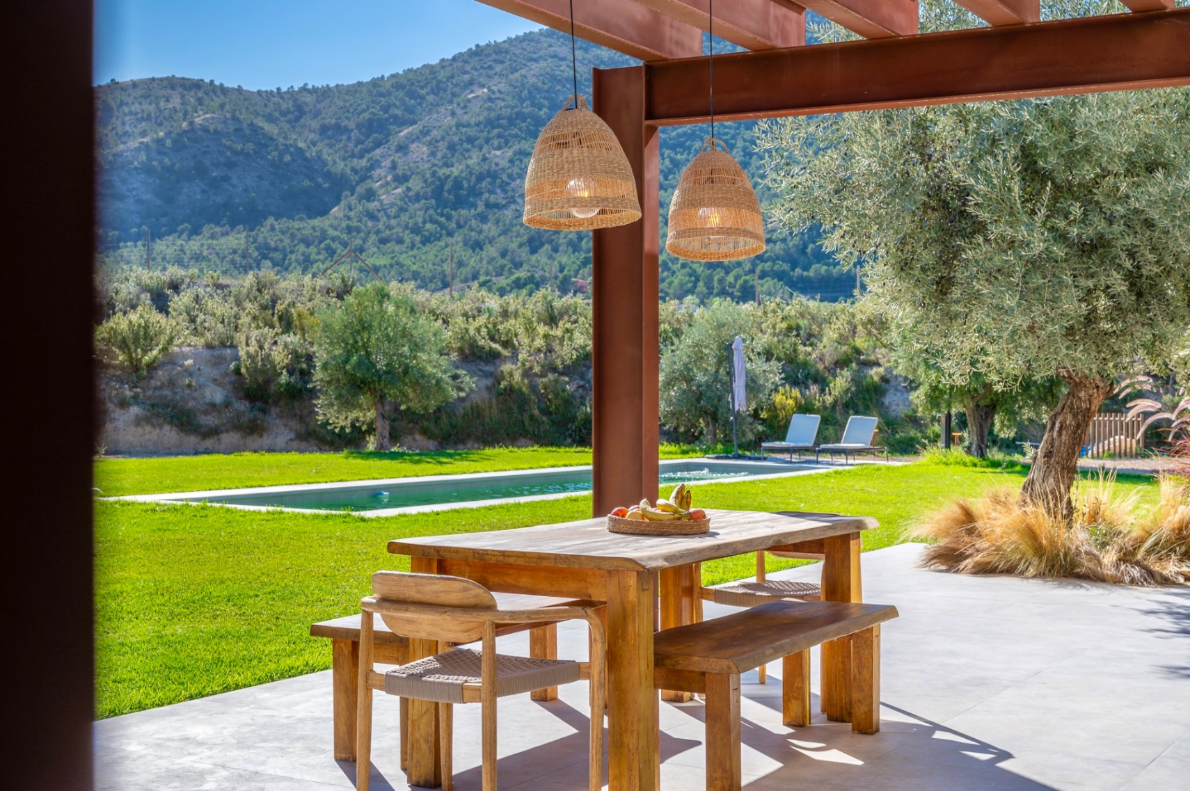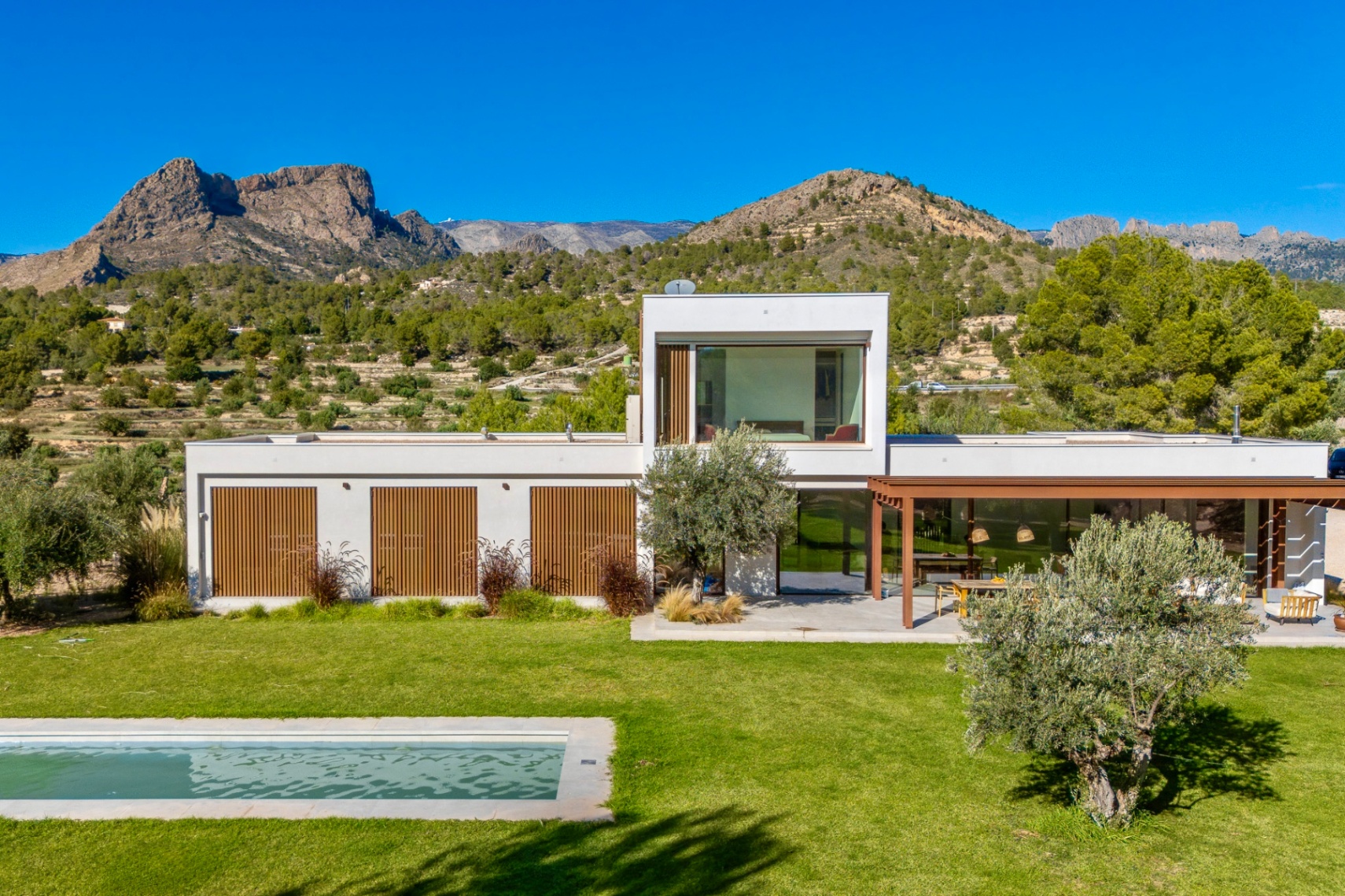 Outside, the property features an automated chlorine swimming pool, landscaped garden, pergola prepared for additional solar panels, and a large parking area with space for up to fifteen cars. The plot enjoys beautiful mountain views and offers various outdoor spaces designed for year-round enjoyment.