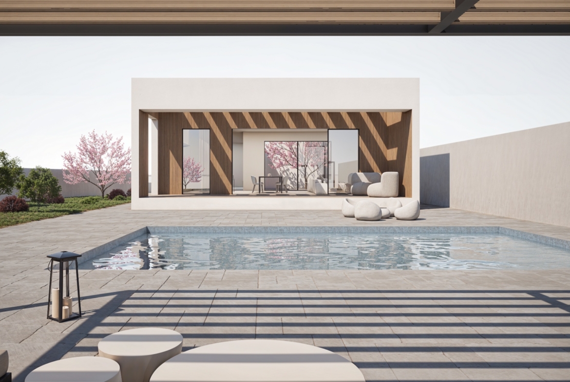 This elegant new build villa in Finestrat offers a spacious layout on a 900 m² plot with 377 m² built, all on one floor. Designed for comfort and modern living, the property features three bedrooms, two bathrooms, and a guest toilet. The openplan kitchen includes a central island and connects seamlessly to the living room, which opens to the pool area through large sliding glass doors.