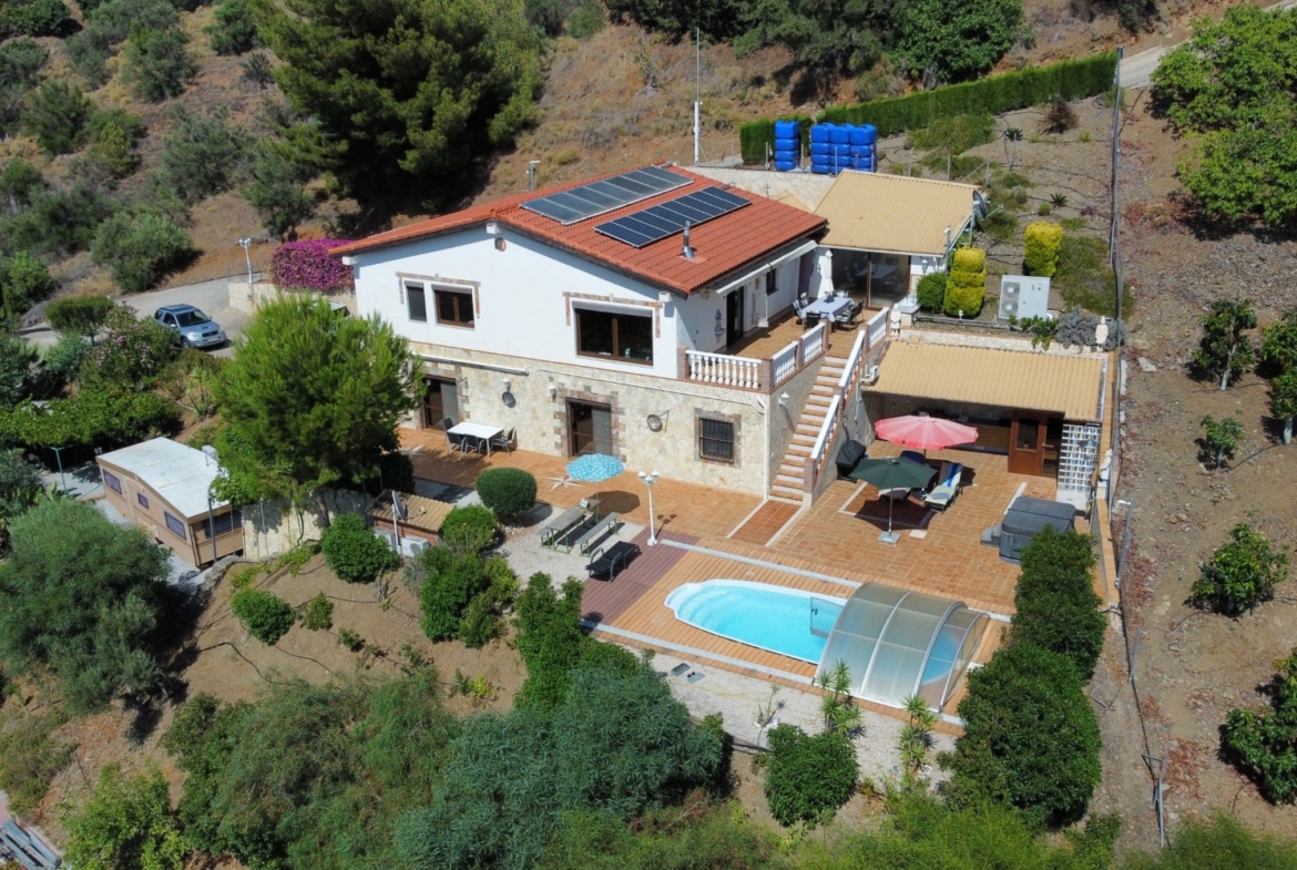 Stunning Villa Below Frigiliana for Sale. This impressive villa, nestled below Frigiliana, offers two separate living units across two floors, each with its own driveway and privacy. The upper unit spans 150 m2 and features a spacious open-plan living and dining area with an adjoining kitchen and convenient storage space. From the terrace, enjoy breathtaking views of the surrounding mountains. A standout feature of this apartment is the rotating fireplace in the living room, adding warmth and ambiance. Additionally, the terrace accommodates a fitness room. Another highlight is the luxurious bathtub in the living room, perfect for relaxing moments. The unit comprises three spacious bedrooms, two bathrooms (one en-suite in the master bedroom), and a guest toilet. The lower unit includes a cozy living and dining area with a kitchen, one bedroom, and a bathroom, totaling 80 m2 of living space. The entire house is equipped with underfloor heating, air conditioning, and a central vacuum system, built to the highest German standards with excellent insulation and quality materials. A solar panel system on the roof provides heating and hot water. The outdoor area of this exceptional villa leaves nothing to be desired. There is a heated saltwater pool with an easy-to-operate cover, a relaxing jacuzzi, and a fully equipped outdoor kitchen with a sauna. Additionally, there is a workshop, a caravan, and another small building at the foot of the property. The 6000 m2 plot is adorned with numerous fruit trees, inviting nature lovers to linger. The villa boasts good connectivity and is perfect for those who appreciate a tranquil lifestyle amidst nature. Experience luxurious living in a breathtaking location your new home below Frigiliana awaits! We are pleased to be able to present this dream property to you soon, either personally or via virtual viewing. Because this world is unique - just like our Axarquía. In Andalusia. On the Costa del Sol. Here, on the sunny side of life...