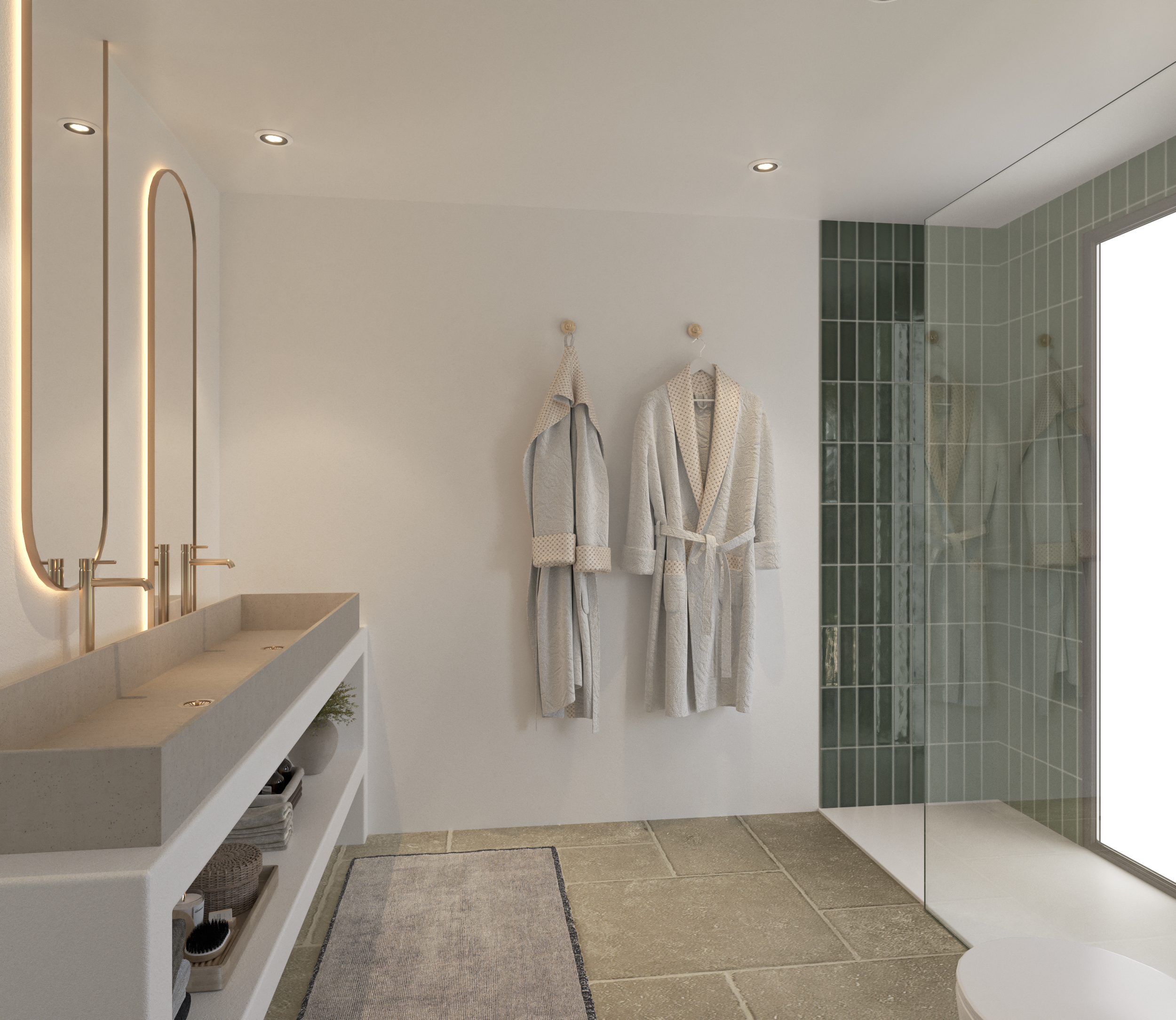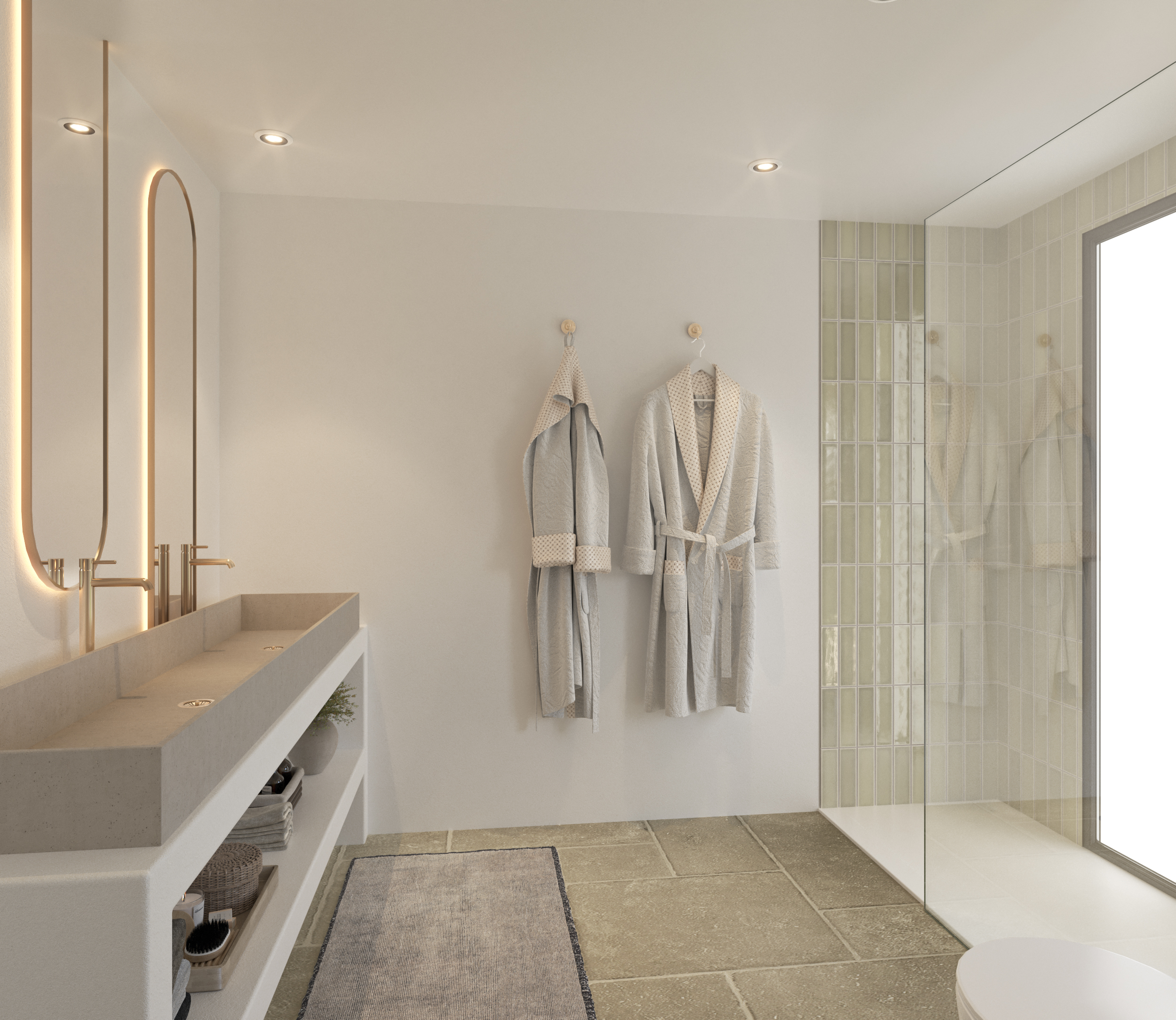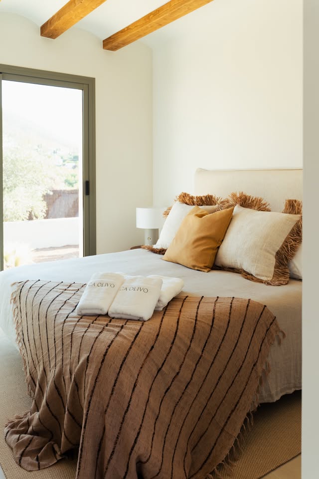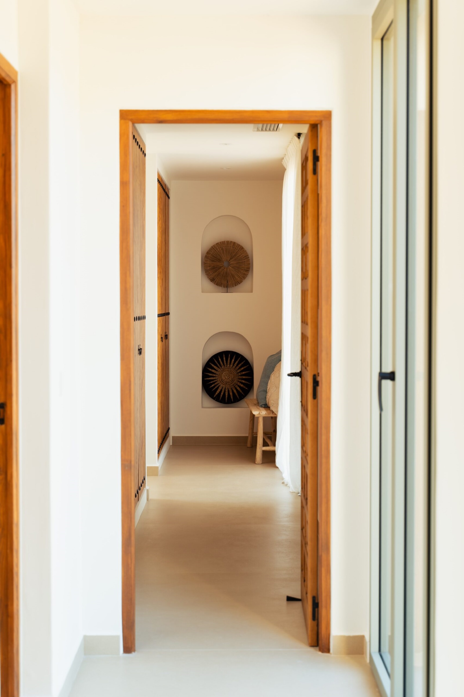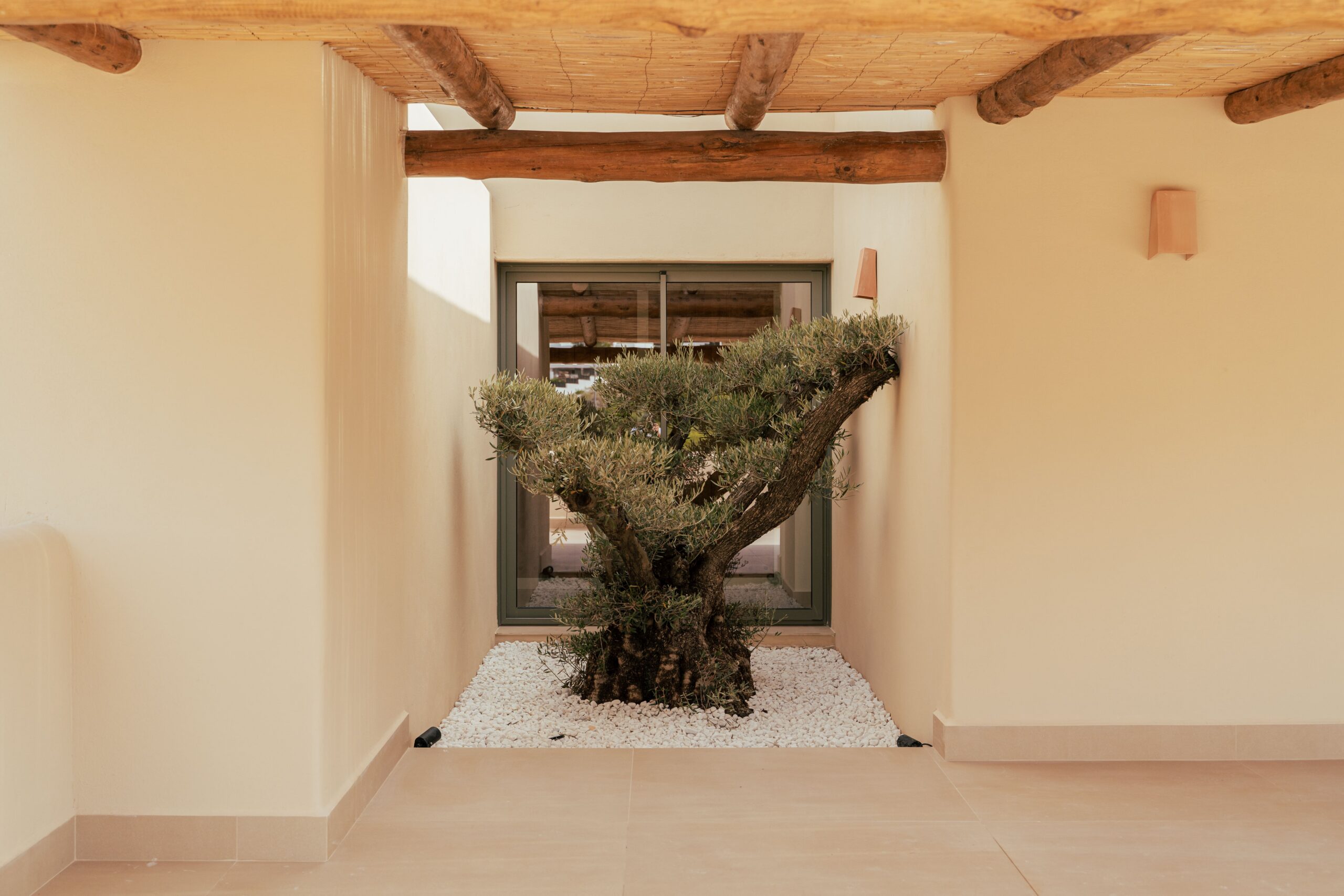 Construction on Villa Loma began in February 2024, with completion set for January 2025. The villa boasts a southwest orientation and combines Mediterranean and Ibizan architectural influences, featuring soft, rounded corners, vaulted ceilings with exposed beams, and large windows with shutters that flood the space with natural light. This harmonious design captures the beauty of the surrounding landscape, creating a peaceful and elegant living space.