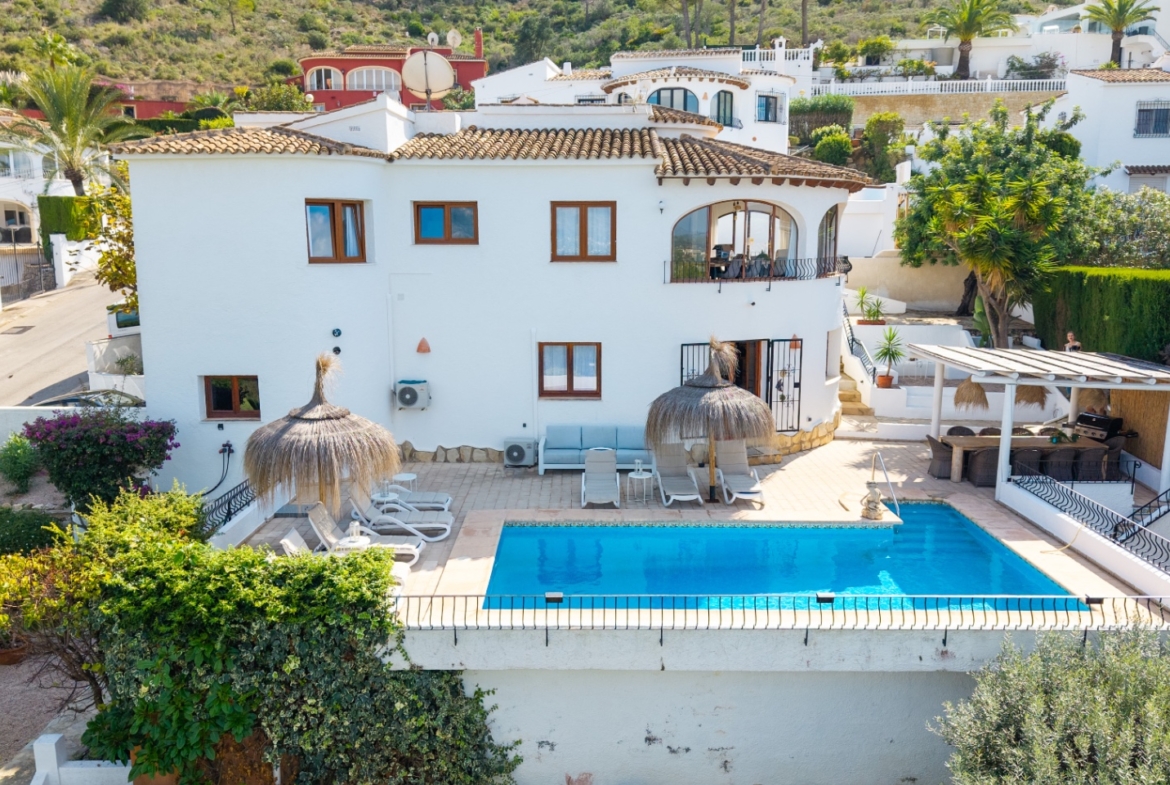 Located in Cansalades, this villa enjoys sweeping views across the Montgó and the distant bay of Jávea, perfectly positioned to capture the west-facing sunsets that define this area. The location is exceptionally convenient, with XIC (Xàbia International College), supermarkets and a range of restaurants all within walking distance. The main level feels bright, open and contemporary while still holding onto its Mediterranean character. The open-plan living and dining area is oriented to maximise the stunning Montgó view, creating a natural focal point that changes with the light throughout the day. A feature log burner adds warmth and texture, complementing the modern yet relaxed atmosphere. The separate kitchen is spacious and fully equipped with a gas hob, electric oven, dishwasher, washing machine and fridge-freezer. This level includes two double bedrooms with fitted wardrobes and two shower rooms. On the lower level, a self-contained second villa—accessed independently from both sides—offers complete flexibility for guests or extended family. It includes a fully equipped kitchen-diner and a comfortable living area opening directly onto the pool terrace. Accommodation comprises a twin bedroom with an ensuite shower room, a large double bedroom with fitted wardrobes, and an additional twin bedroom with separate access; the double and the separate-access twin share a Jack-and-Jill shower room. The property also includes a garage for storage, a secure garden area and off-road parking for three cars. Comfort is assured year-round with gas central heating, hot-and-cold air conditioning, and the feature log burner in the main lounge. A stylish yet authentic home with panoramic Montgó views, a true Mediterranean atmosphere, and separate guest accommodation — all within easy reach of Jávea’s schools, shops and restaurants.