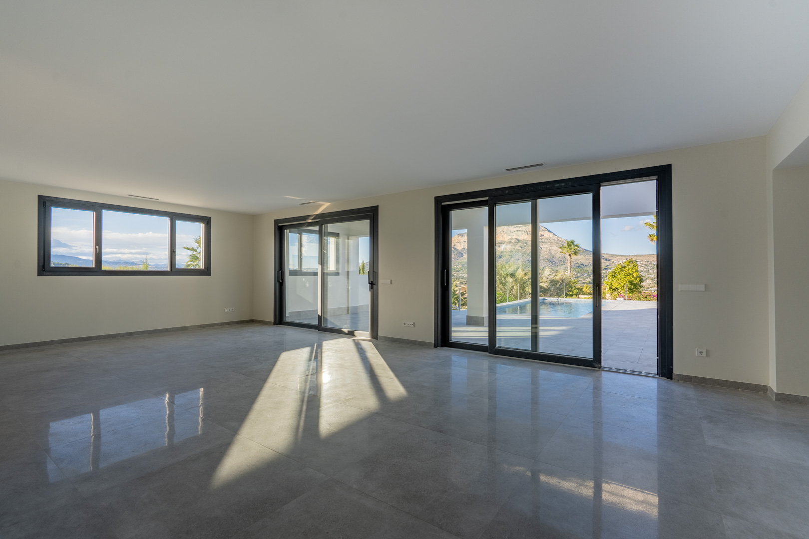 This exclusive new build villa, located in the beautiful Piver urbanisation, offers beautifl views of the imposing Montgó and the mountainous interior. The villa is set on a spacious plot of 1,147.94 m2 and is designed entirely on one level for optimal comfort and accessibility. Upon entering, a stylish hall with guest toilet leads to the spacious living-dining room, where large windows provide abundant natural light and a beautiful panorama. Adjacent is a modern, fully equipped kitchen with a practical laundry room that offers direct access to the outside. Sliding windows in the living room open onto the inviting terrace with swimming pool, ideal for enjoying the view and the Mediterranean climate. The sleeping area comprises three bedrooms, including an elegant master bedroom with en-suite bathroom and direct access to the terrace, while the two other bedrooms share a second bathroom. The outdoor area is an oasis of tranquillity with a covered terrace, a pergola, a spacious sun terrace and a low-maintenance Mediterranean garden. With two parking spaces on site and a location just 2 km from the historic centre and 3 km from the coast, this villa combines luxury, privacy and excellent accessibility.