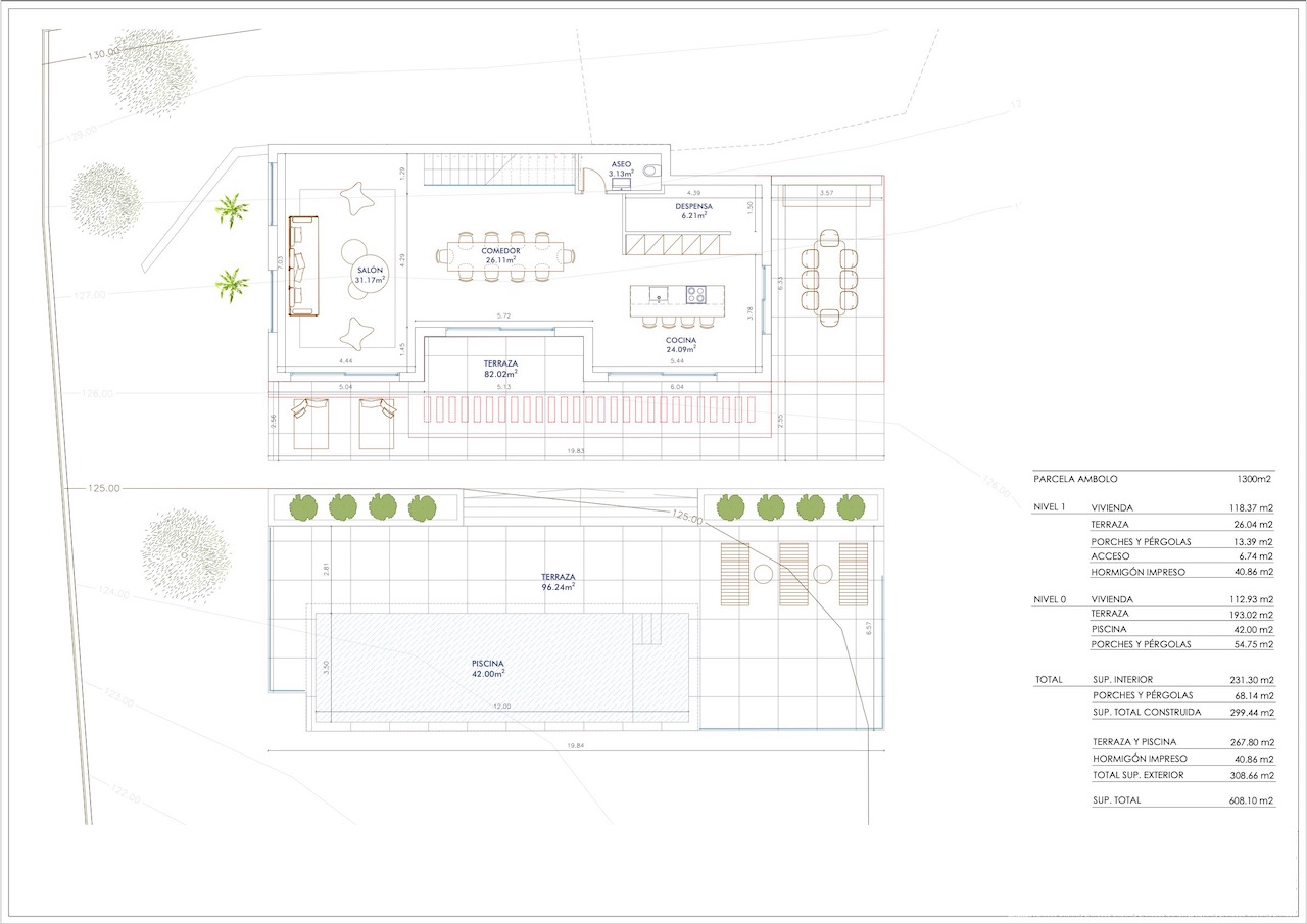Exclusive location in Torre Ambolo, JáveaSouth orientation with sea and mountain viewsContemporary Mediterranean-inspired design4 bedrooms and 4 bathroomsSpacious open-plan living areas filled with natural lightDesigner kitchen with central islandExpansive terraces and landscaped gardensPrivate pool as the centrepiece of outdoor livingPlot size 1,305 m², living area 231 m²Garage for 2 cars and high-quality finishes throughout