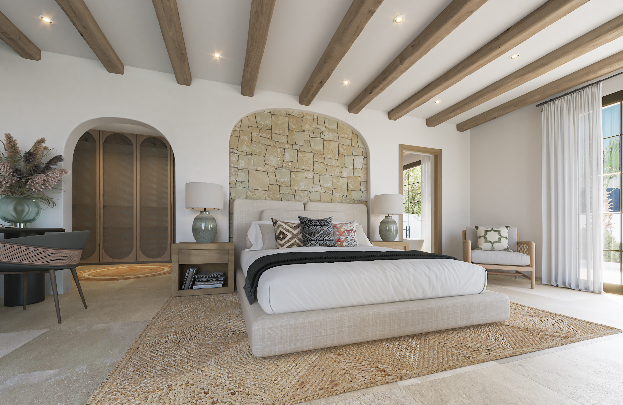 Reserved entirely for the master suite, occupying the entire upper level. It has a dressing room, a private bathroom and a private terrace with open views of the valley and the Montgó.