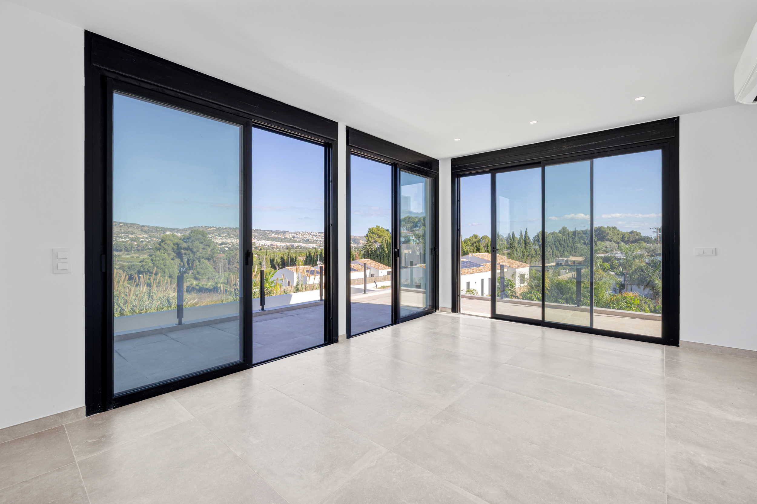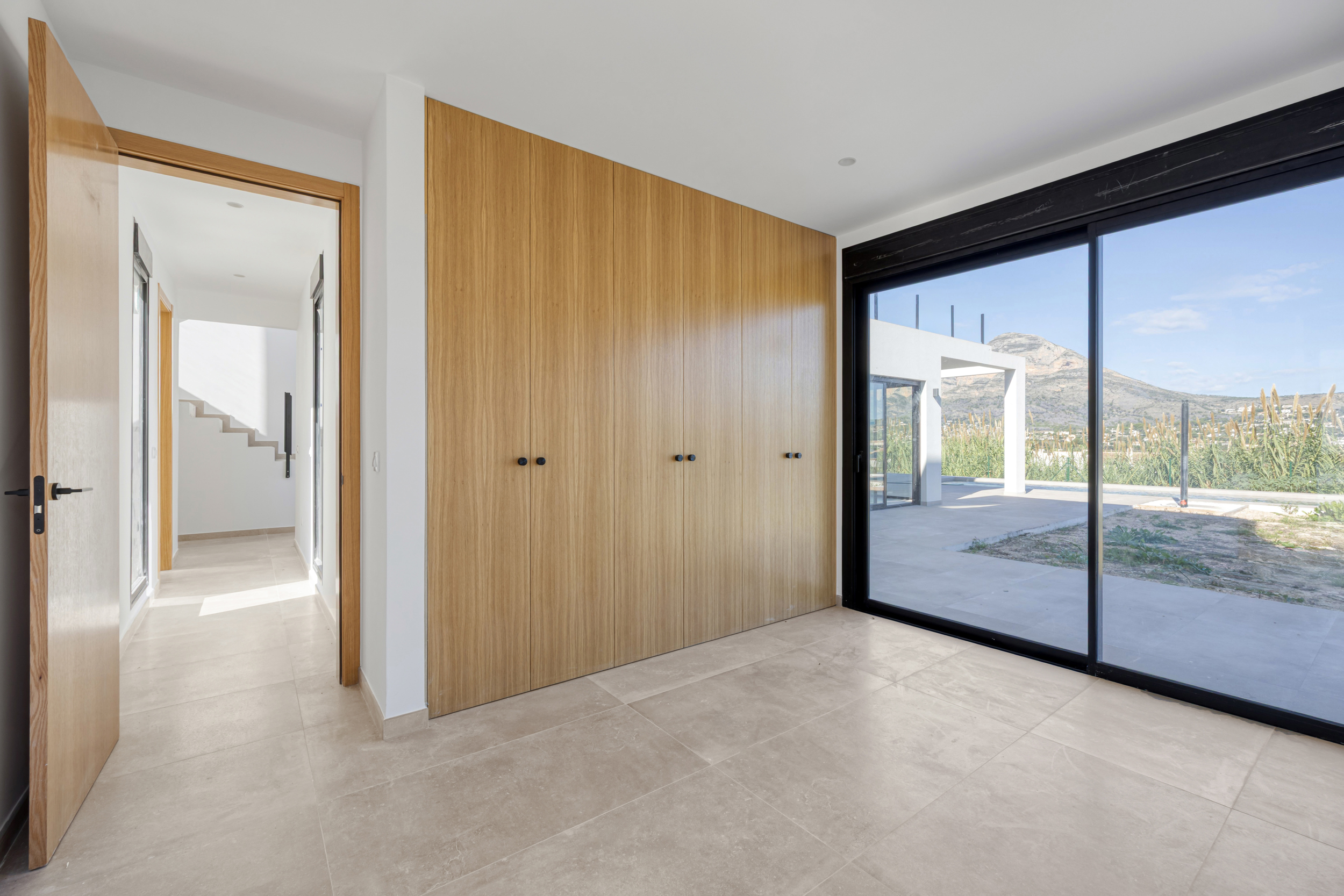 The upper level includes a bedroom with en-suite bathroom and private balcony, as well as a large master suite with a dressing room, luxurious en-suite bathroom, and a spacious terrace with breathtaking Montgó views.