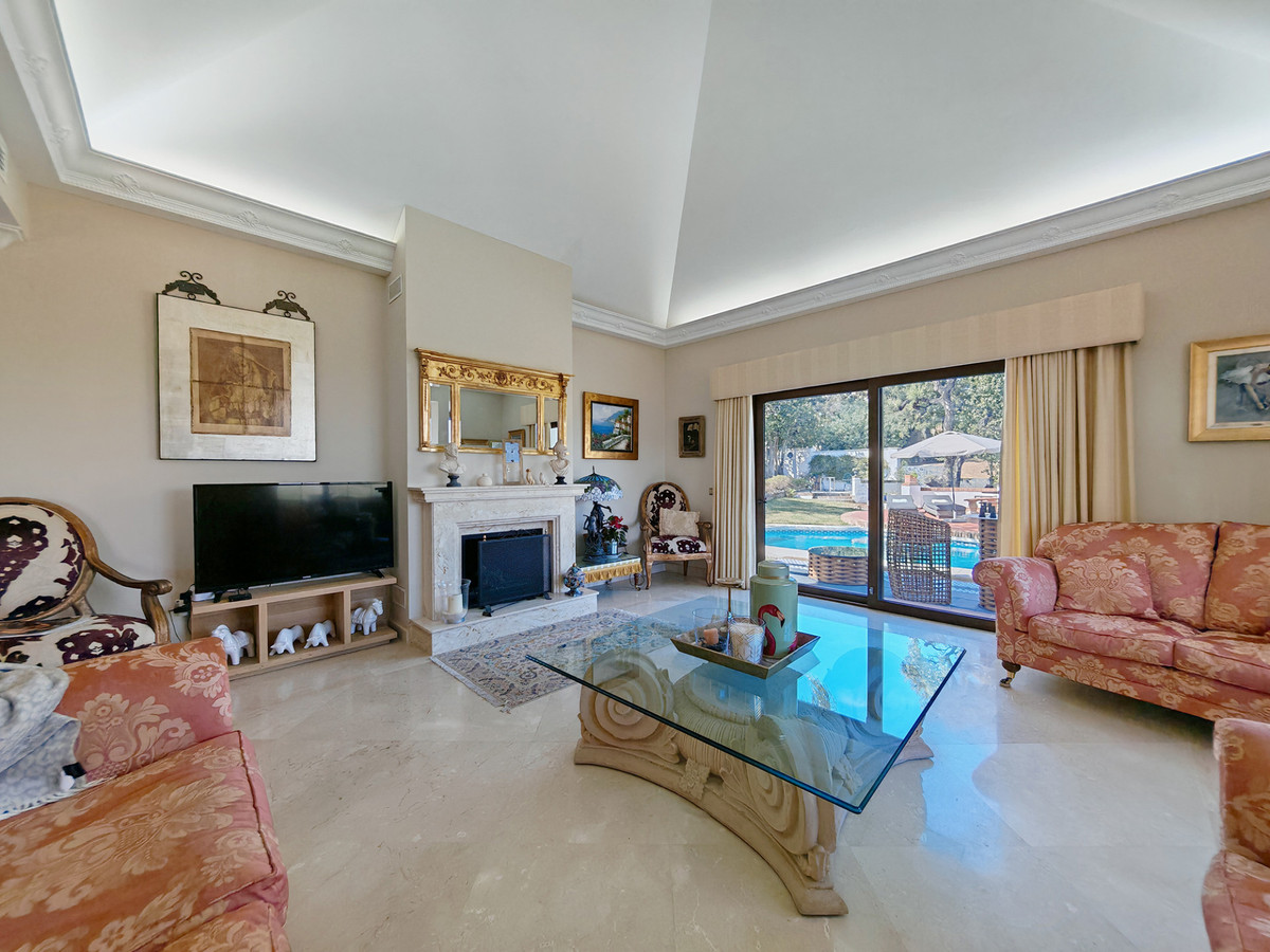 Villa for sale in , Mijas Costa with 4 bedrooms, 4 bathrooms, 3 en suite bathrooms and with orientation south, with private swimming pool, carport garage (2 parking spaces) and private garden. Regarding property dimensions, it has 463 m² built, 1,109 m² plot and 74 m² terrace. Has the following facilities front line golf, air conditioning, central heating, partly furnished, fully fitted kitchen, utility room, fireplace, marble floors, jacuzzi, basement, solar panels, guest room, storage room, alarm, double glazing, dining room, guest toilet, private terrace, kitchen equipped, living room, study room, mountain view, golf view, underfloor heating (throughout), laundry room, internet - wi-fi, covered terrace, panoramic view, underfloor heating (bathrooms), close to golf, uncovered terrace, balcony, excellent condition and office room.