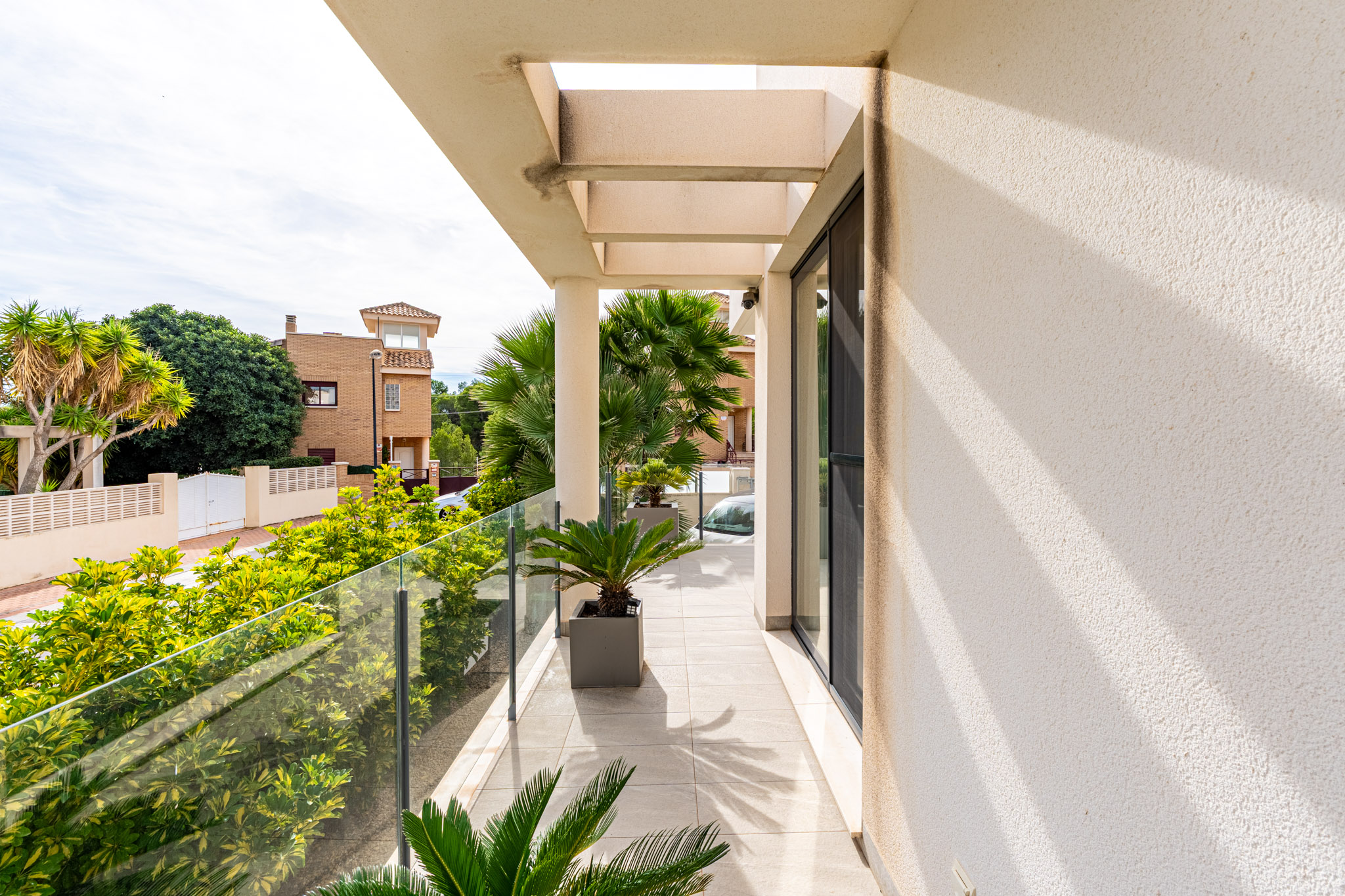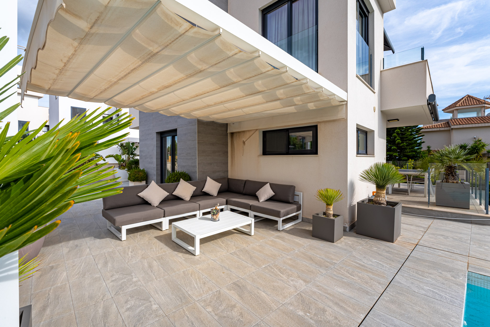 For year-round comfort, the villa is equipped with centralized air conditioning, a home automation system, 24-hour security, electric blinds, double glazing, and central heating. Pre-installations for a jacuzzi and an outdoor kitchen are in place, and there is an option to add a solar energy system. Outside, the beautifully landscaped garden and private swimming pool create a serene space for relaxation and entertaining.