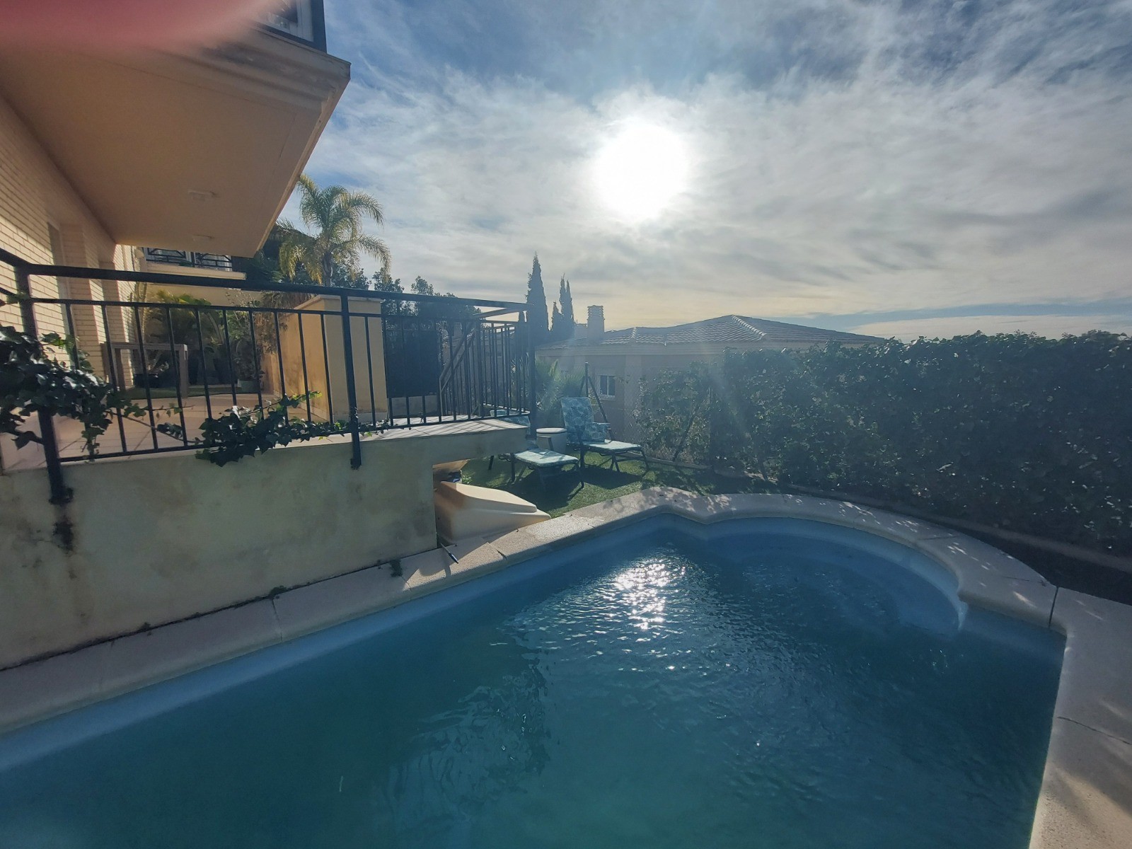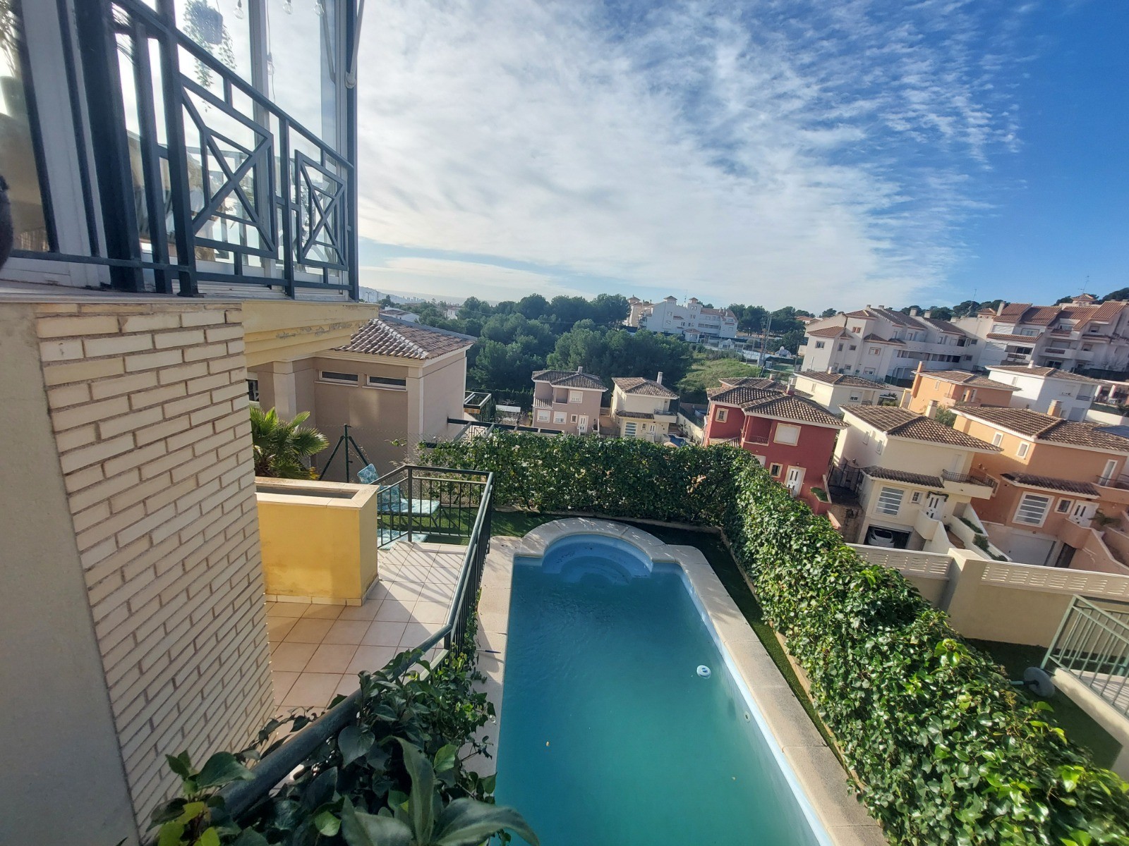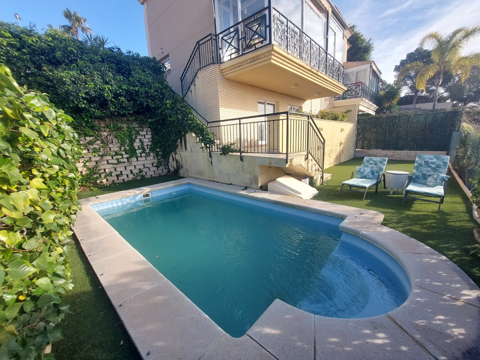 Outside, the villa enjoys a well-maintained garden that surrounds the private swimming pool, offering the perfect setting to enjoy the Mediterranean climate. At the front of the property, a spacious patio provides secure off-street parking for several vehicles, combining practicality with privacy.