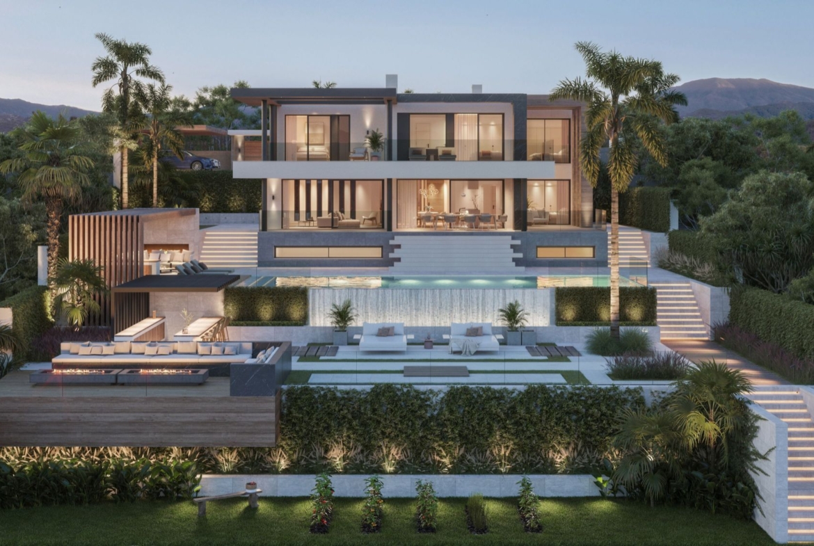 Imagine having views of the spectacular hills in the distance, while enjoying the convenience of being just minutes from the sea and the beach. Add to this idyllic concept the availability of world class golf facilities right at your doorstep. This new and luxurious development makes this a reality, here in the municipality of Mijas, Málaga. The project is fully managed by experienced and reputable developers who have over two decades of experience in the area. The considerable appeal and convenience of having a high-quality golf course on-site is further enhanced by the established fitness centre and quality restaurants just a few hundred metres from the property. This exclusive development with the best golf, lake and sea views in Fuengirola and Mijas comprises thirteen individual villas, each offering no less than four en-suite bedrooms. These unique luxury villas are considered larger and of a higher quality than others available on the Costa del Sol. Three of the bedrooms are located on the top floor, while another is adjacent to the living area. There is a large basement area with space for storage or expansion for other purposes, such as additional bedrooms, a games area, gym, cinema, etc. The luxurious open plan living areas are designed to facilitate daily living. The kitchen, dining area and living room are connected on one level to provide easy access and open spaces with panoramic, golf and ocean views. Within the property, the bathrooms and kitchens are fitted only with high quality products from leading, luxury European manufacturers. An important “high-tech” feature of these villas is the ability to control many aspects of the property via VTouch Pro. With the swipe of your finger, you can control lights, blinds, set your security system or control your HVAC (ventilation, heating and AC) through an app on your mobile device. In case your device doesn’t work properly, or you simply prefer not to use it, you can control these functions by using the VTouch Pro buttons directly. Geographically, the thirteen luxury villas are arranged in an arc that wraps around one of the greens of the golf course. Thanks to this, this project has one of the best panoramic views on the entire Costa del Sol.