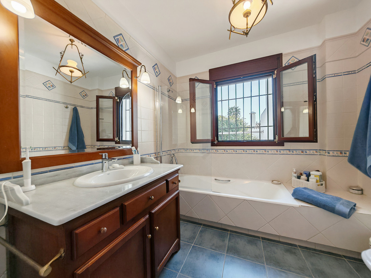 Villa for sale in , Mijas Costa with 5 bedrooms, 4 bathrooms, 1 on suite bathroom and with orientation east, with private swimming pool, private garage (3 parking spaces) and private garden. Regarding property dimensions, it has 450 m² built and 858 m² plot. Has the following facilities amenities near, transport near, air conditioning, fully fitted kitchen, utility room, satellite tv, storage room, solarium, barbecue, guest toilet, kitchen equipped, living room, study room, water tank, mountain view, automatic irrigation system, security shutters, laundry room, covered terrace, fitted wardrobes, garden view, pool view, panoramic view, street view, unfurnished, close to golf, uncovered terrace, games room, balcony, good condition, close to town, close to schools, surveillance cameras, inside golf resort and office room.