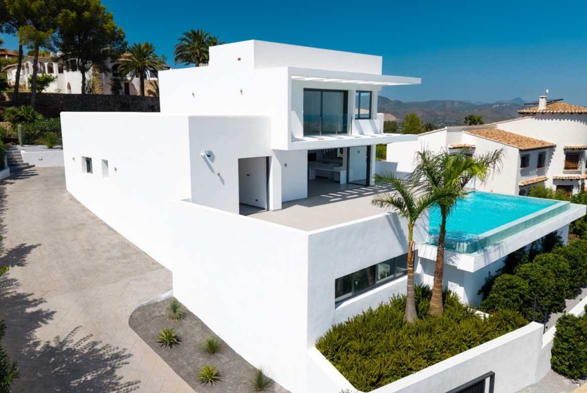 This exceptional new-build villa in Monte Pego is a true one-of-a-kind. Built by the current owner without consideration for resale or profit, no expense has been spared in creating a home of the highest quality. Every detail has been carefully considered, combining cutting-edge design, energy efficiency, and luxurious finishes. Situated on a quiet residential road, the villa enjoys breathtaking panoramic views of the sea, mountains, and surrounding countryside. The property is contemporary and spacious throughout, with all modern conveniences seamlessly integrated. Energy efficiency has been prioritised, with 38 solar panels and heavily insulated walls ensuring extremely low running costs. The landscaped grounds are already established, featuring mature planting that is rarely found with new builds. A motorised gate opens onto the driveway, which is beautifully lit with LEDs and leads to a large parking area. Stepping inside, you are immediately met with spectacular views. The vast open-plan living area flows around a stylish Porcelanosa kitchen, fully equipped with top-of-the-line Gaggenau appliances – from wine coolers to hot plates, every feature has been carefully chosen. Expansive sliding doors disappear into the walls, merging the interior with the outdoor terrace, where a heated infinity pool with pearlescent tiling provides the perfect place to relax while taking in the views. On the main level, there are two double bedrooms, each with en-suite bathrooms, along with a guest bathroom. A glass balustrade staircase with LED lighting and a floor-to-ceiling feature window leads to the impressive master suite, which occupies the entire upper floor. This luxurious retreat includes an oversized bedroom, walk-in dressing room, and a Porcelanosa bathroom with breathtaking views from the bathtub. The master suite also boasts a private terrace, ideal for enjoying the panorama in peace. Below the villa, additional space is available that could be converted into another bedroom, office, or leisure area, offering flexibility to suit your lifestyle. This is a rare opportunity to acquire one of the finest quality villas in Monte Pego – a property that perfectly balances style, substance, and sustainability. Contact us today to arrange a private viewing.
