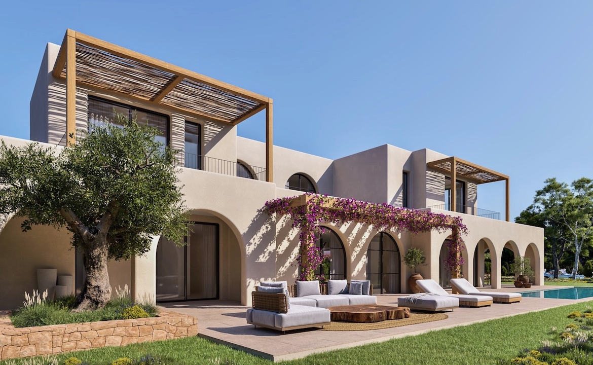 The villas blend contemporary architecture with Mediterranean charm, featuring stone details, wooden pergolas, arches in the nayas, and landscaped gardens. Large terraces and private pools create seamless indoor-outdoor living spaces, designed for relaxation and entertaining. Inside, the open-plan layout combines comfort and elegance, with 4 bedrooms, 5 bathrooms, and thoughtfully designed areas that flow naturally to the exterior.