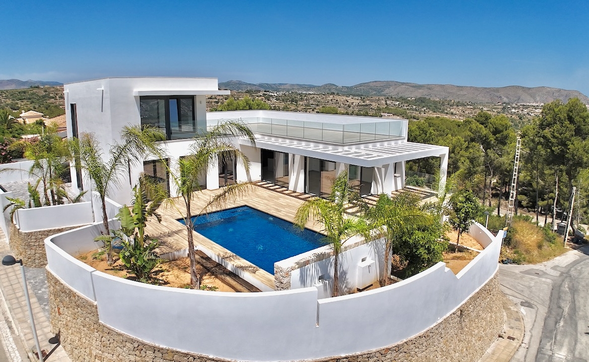 Finished modern villa located on a 817 m² corner plot in Moraira, Benimeit.The property consists of 2 floors and two under builds, one of 103 m², which could be converted either into a gym, cinema or games room and one of 200m2 which could be converted in an additional full living area. The ground floor consists of 2 bedrooms sharing a bathroom, open plan living/dining area with a fully fitted kitchen and a guest toilet. From this floor you also have flat access to the pool with a spacious sun terrace. On the first floor you find the master bedroom with an en-suite bathroom, a walk-in closet and access to a private terrace. Additional features are: electric gate, ample off road parking, easy to maintain garden, natural stone walls surrounding the plot and 10.000l water deposit. For more information please and plans please contact our office in the centre of Moraira.