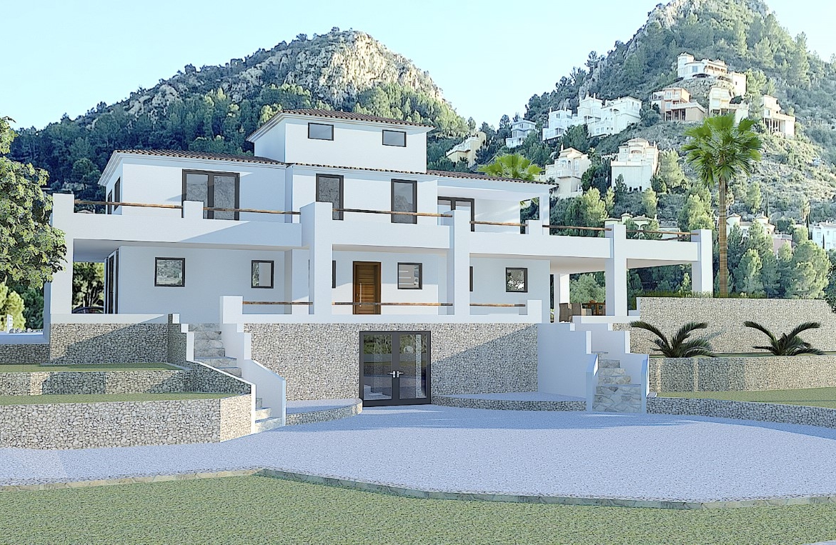 Villa with sea view for sale in Pedreguer, very quietly located and built on a flat plot of over 10,000m2 at an altitude of 70m above sea level with beautiful views of the mountains and the sea all around. The existing house dates from 2008 and is completely renovated according to corresponding building plans. The house consists of 3 floors with a total built area of 550m2. On the ground floor there is a large living room with a spacious open fully equipped kitchen, an entrance hall, a guest toilet and a bedroom with en-suite. The upper floor has a large landing with access to 4 double bedrooms with balconies with mountain or sea views and two spacious bathrooms with the possibility of expanding to a third bathroom. In a lower floor there is a gym and fitness room with a bathroom and sauna, a play area for table tennis or pool table, additional space for cinema and a garage. Furthermore, there is a spacious covered terrace with lounge sofa and a large roof terrace with beautiful sea views. In the garden there is a pool of 50m2, a large covered outdoor kitchen and a carport for 4 cars. The garden is divided into several areas, there is a landscaped garden with lawn and palm trees of 1000m2, an orchard with almond trees and olive trees of 5000m2 and there are facilities for keeping horses.