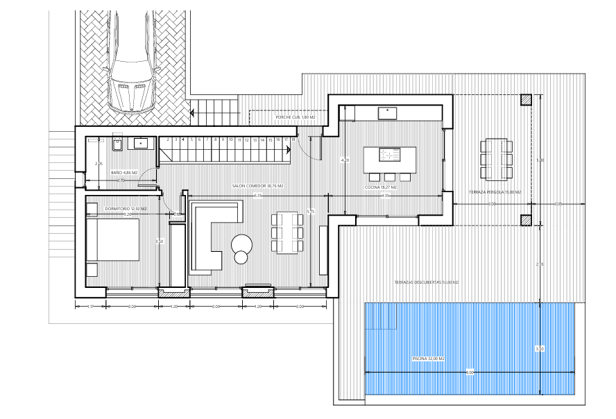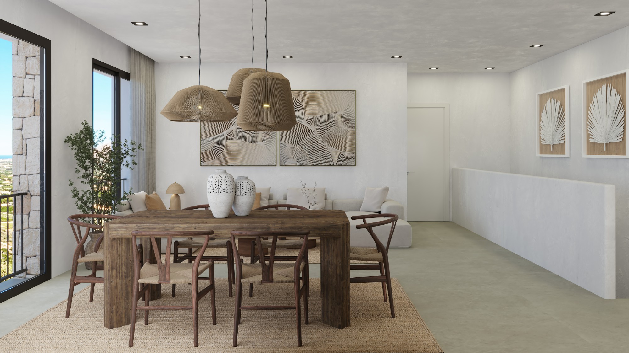 Villa de ensueño con vistas al mar en ubicación exclusiva e infinity poolSituada en la codiciada urbanización Monte Solana en Pedreguer, esta impresionante villa combina armoniosamente la arquitectura rústica de estilo ibicenco con elementos modernos, creando un ambiente elegante y acogedor. Ubicada sobre una amplia parcela de 1.272 m², la propiedad ofrece un alto nivel de privacidad, tranquilidad y unas vistas espectaculares al mar Mediterráneo. Con una superficie construida de aproximadamente 159 m², la vivienda destaca por un diseño abierto y funcional. La luminosa zona de estar con cocina integrada constituye el corazón de la casa y se conecta de forma fluida con el comedor. Los grandes ventanales permiten una abundante entrada de luz natural y crean una perfecta conexión entre el interior y el exterior. Los materiales naturales de alta calidad y una paleta de colores neutros refuerzan la sensación de amplitud y bienestar. Una amplia terraza de 53 m² invita a disfrutar plenamente del clima mediterráneo. En el exterior, la propiedad dispone de una elegante piscina infinity con vistas al horizonte, varias zonas de terraza y una pérgola de madera, ideales para el descanso al aire libre. Esta vivienda combina confort moderno con estilo de vida mediterráneo, siendo perfecta para quienes buscan exclusividad y relax en una ubicación privilegiada. Los muros exteriores están compuestos por un sistema multicapa con fábrica de ladrillo, aislamiento térmico y revestimiento de mortero. Los tabiques interiores están enlucidos, mientras que los baños están completamente alicatados. La cubierta plana se ejecuta como transitable y no transitable, con impermeabilización, aislamiento y formación de pendientes. Las ventanas son de aluminio con doble acristalamiento, complementadas con persianas eléctricas en los dormitorios. La puerta de entrada es de seguridad, y el interior cuenta con puertas lacadas y armarios empotrados. Los interiores se terminan con materiales de alta calidad, incluyendo cocina moderna, baños elegantes e instalaciones técnicas completas. La zona exterior incluye jardín, sistema de riego, zona de aparcamiento y puerta de acceso. Además, se incluye una piscina de hormigón armado. Características técnicas Suministro eléctrico de 13,5 kW / 220 V 6 circuitos eléctricos Conexiones de TV, FM y teléfono en salón y dormitorios Antena de TV en la cubierta Instalación eléctrica según normativa Sistema de mecanismos JUNG (S990) Sistema de puesta a tierra integrado en la cimentación Tuberías de agua en polietileno reticulado Sistema de saneamiento en PVC Depósito de agua caliente de 200 litrosSistema de aire acondicionado por conductos en todas las habitaciones Sistema inverter con bomba de calor (calefacción y refrigeración)Equipos de Mitsubishi Electric o equivalente Equipamiento Cocina equipada con electrodomésticos BOSCH (placa, horno, campana extractora) Encimera de porcelánico Sanitarios con WC Villeroy and Boch Grifería Grohe (ducha, lavabo, cocina) Platos de ducha a medida (Fiora o similar) Puertas interiores lacadas en blanco Armarios empotrados con revestimiento interior Ventanas de aluminio con doble acristalamiento Persianas eléctricas en dormitorios Puerta de entrada de seguridad con cierre multipunto Calidad y construcción Estructura de hormigón armado Muros exteriores multicapa con ladrillo + aislamiento XPS de 10 cm Enlucidos interiores de yeso liso y acabado blanco Revestimiento exterior hidrófugo con varias capas de pintura Aislamiento térmico de 10 cm en muros y cubierta Sistema de impermeabilización EPDM (FIRESTONE) Aislamiento térmico y acústico estándar Cubierta plana con impermeabilización y formación de pendientes Piscina de hormigón armado con sistema de filtración e iluminación Zona exterior con jardín, vallado, puerta de acceso y aparcamiento