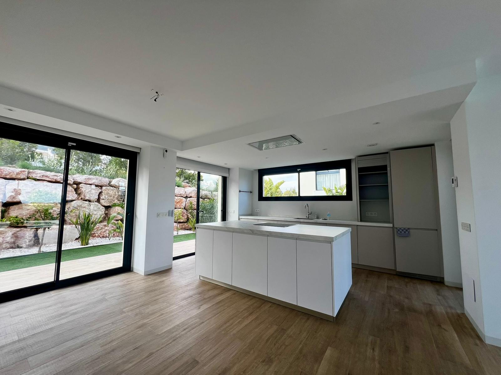 Inside, the villa is designed to maximise natural light and space. Expansive windows create a seamless transition between indoor and outdoor living. The modern open-plan kitchen is both stylish and functional, featuring a sleek integrated extractor, 4-burner cooktop, a premium Miele oven, and generous storage.