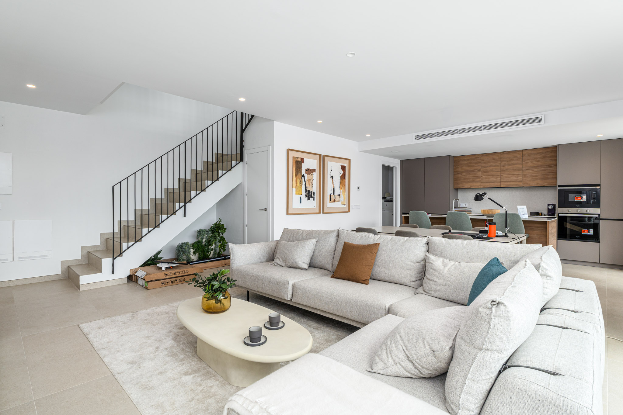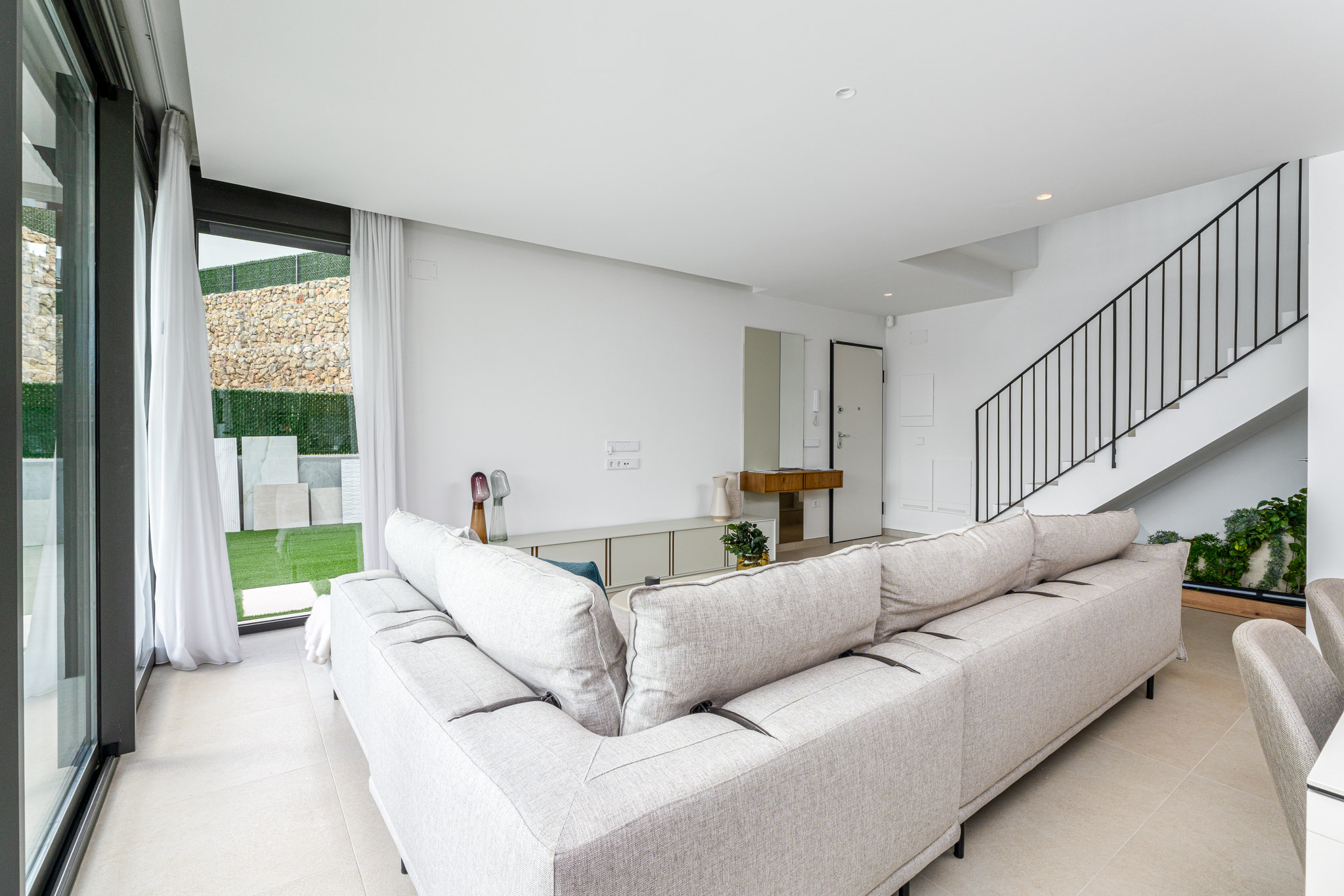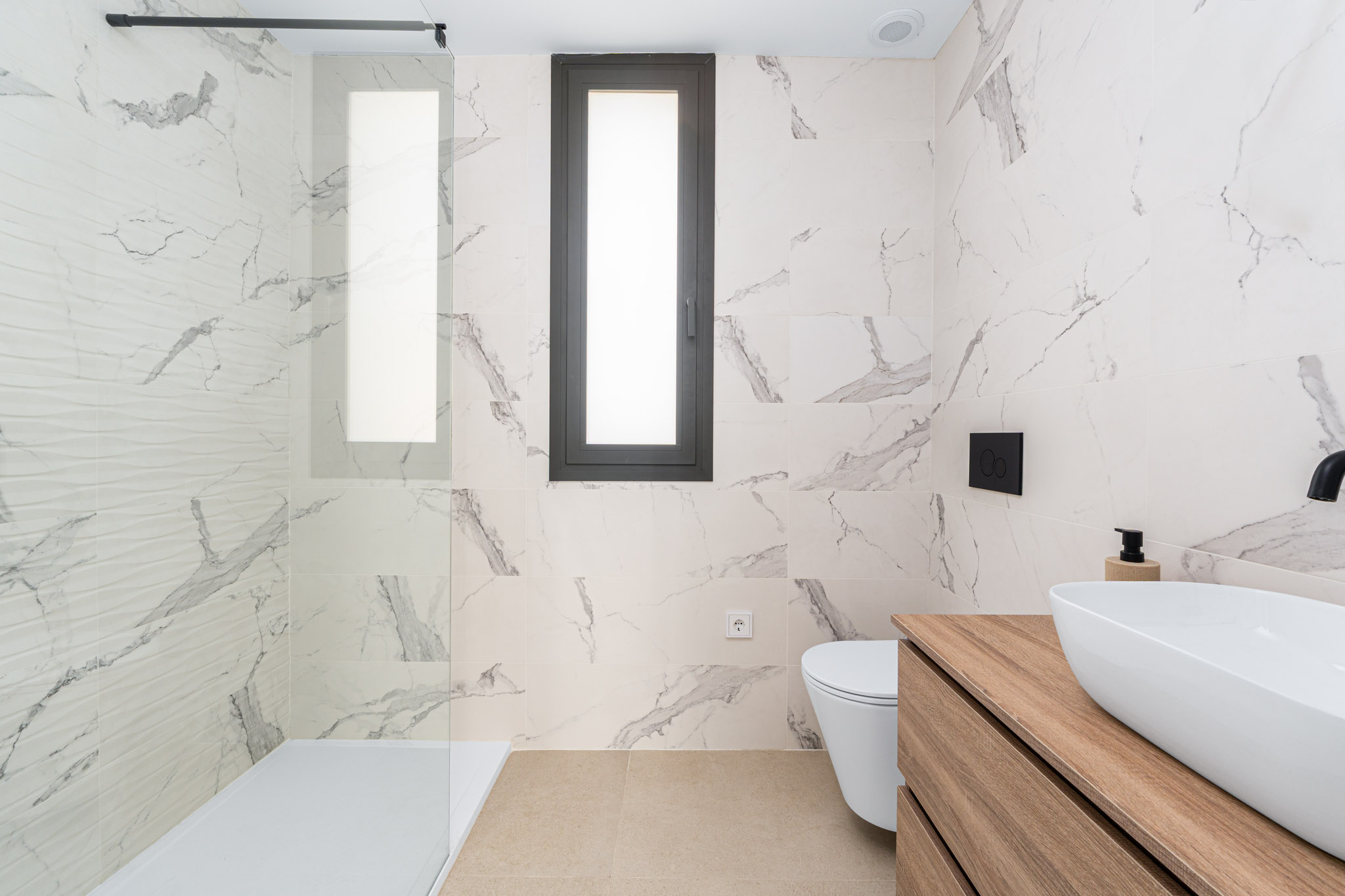 Style: Avantgarde design with simple lines and neutral tones, customizable to your taste. Openconcept kitchens and rooms that open to the outdoors, blending with the landscape. Doors: Armoured entrance, lacquered interior doors, builtin wardrobes. Bathrooms: Porcelain sanitary ware, resin shower tray, black faucets, vanity units. Kitchen: High/low cabinets, granite/resin countertop, Whirlpool appliances (Siemens upgrade available). Climate Control: Ducted A/C, aerothermal hot water, optional underfloor heating.