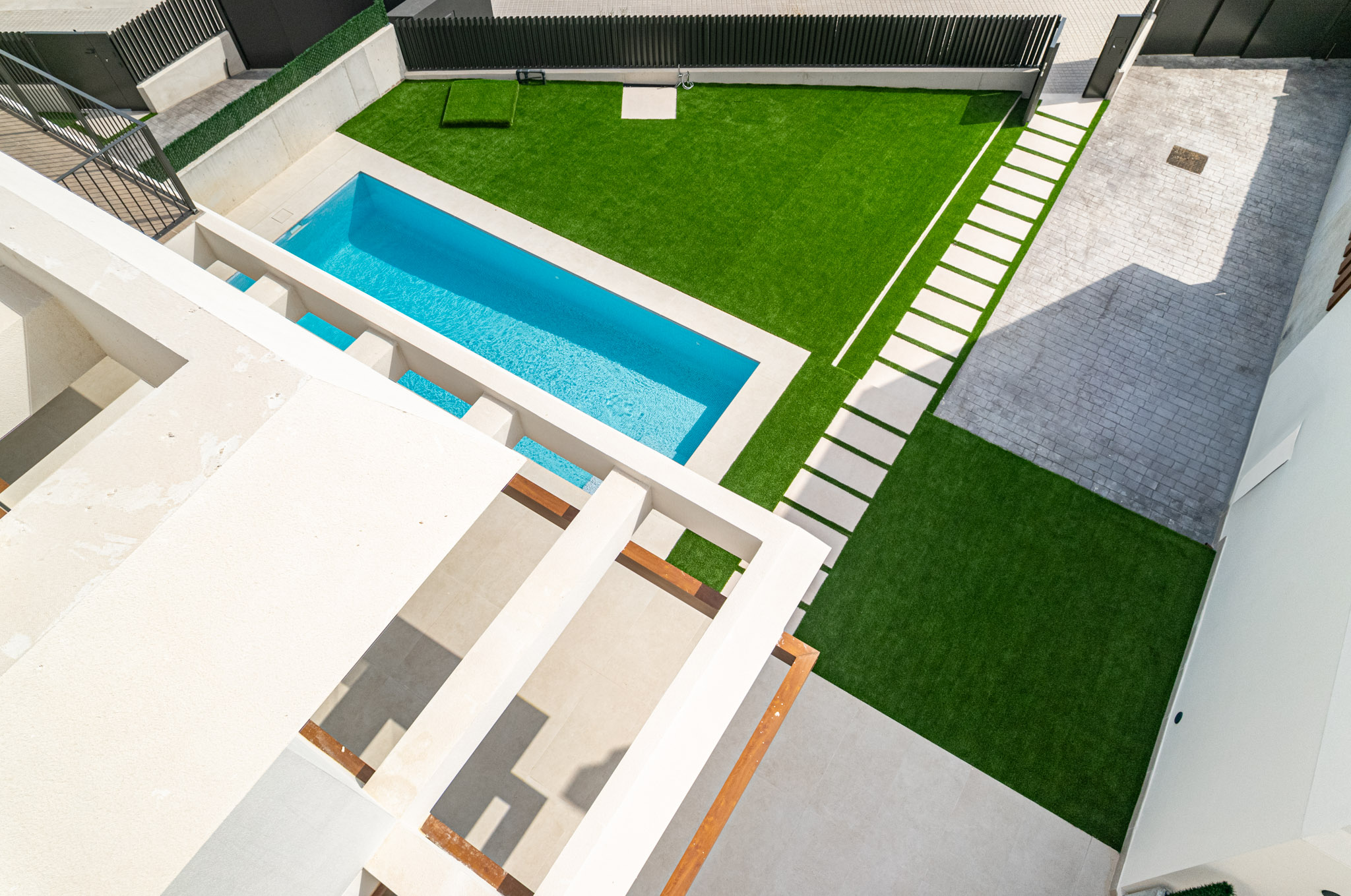 Structure: Reinforced concrete slabs with footings and tie beams. Roof: Flat solarium with waterproofing, insulation, and exterior finishing. Private Plot: Enclosed with concrete walls, metal fencing, sliding gate, parking, and garden (artificial grass, gravel, ceramic pavement).