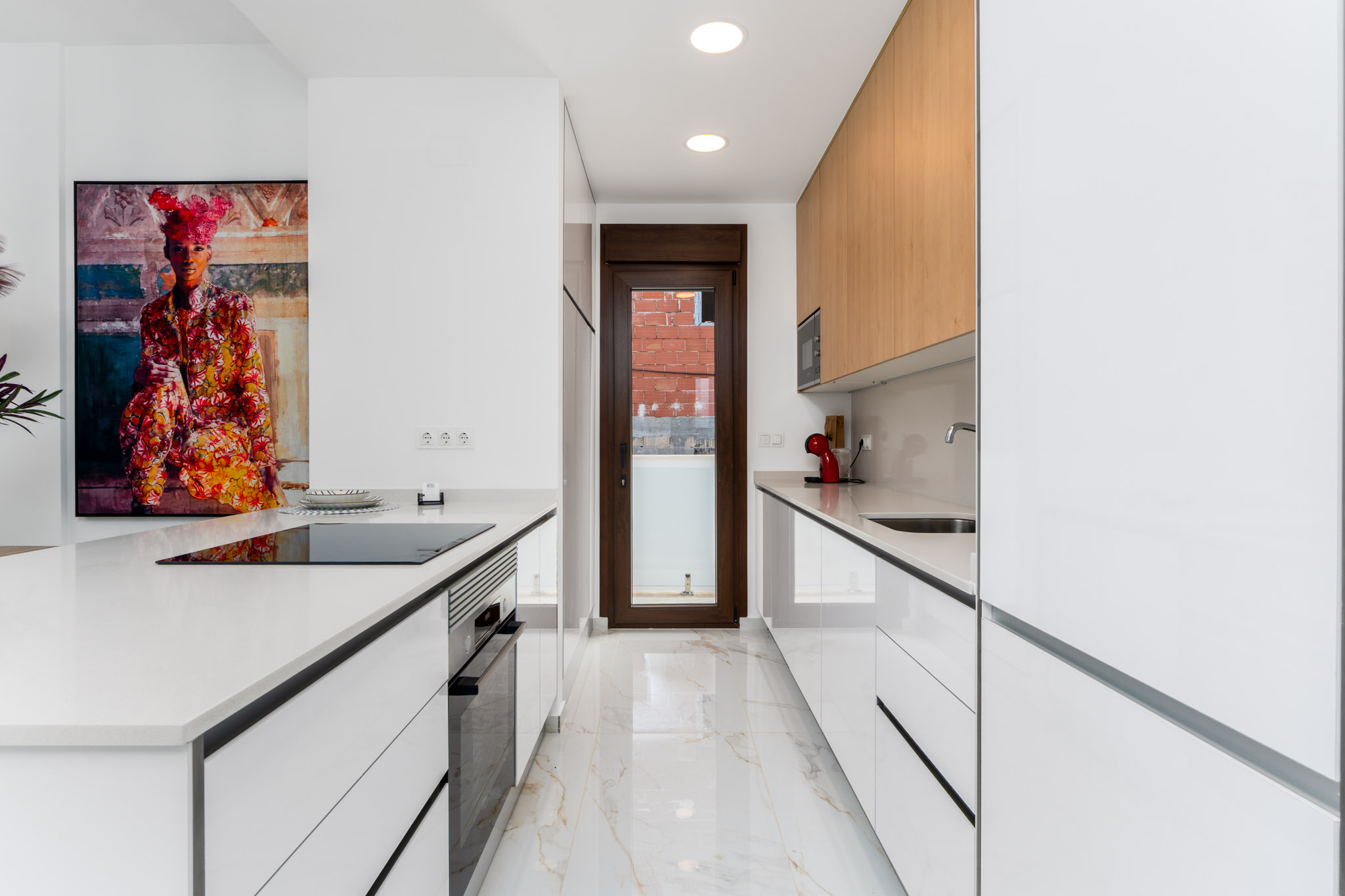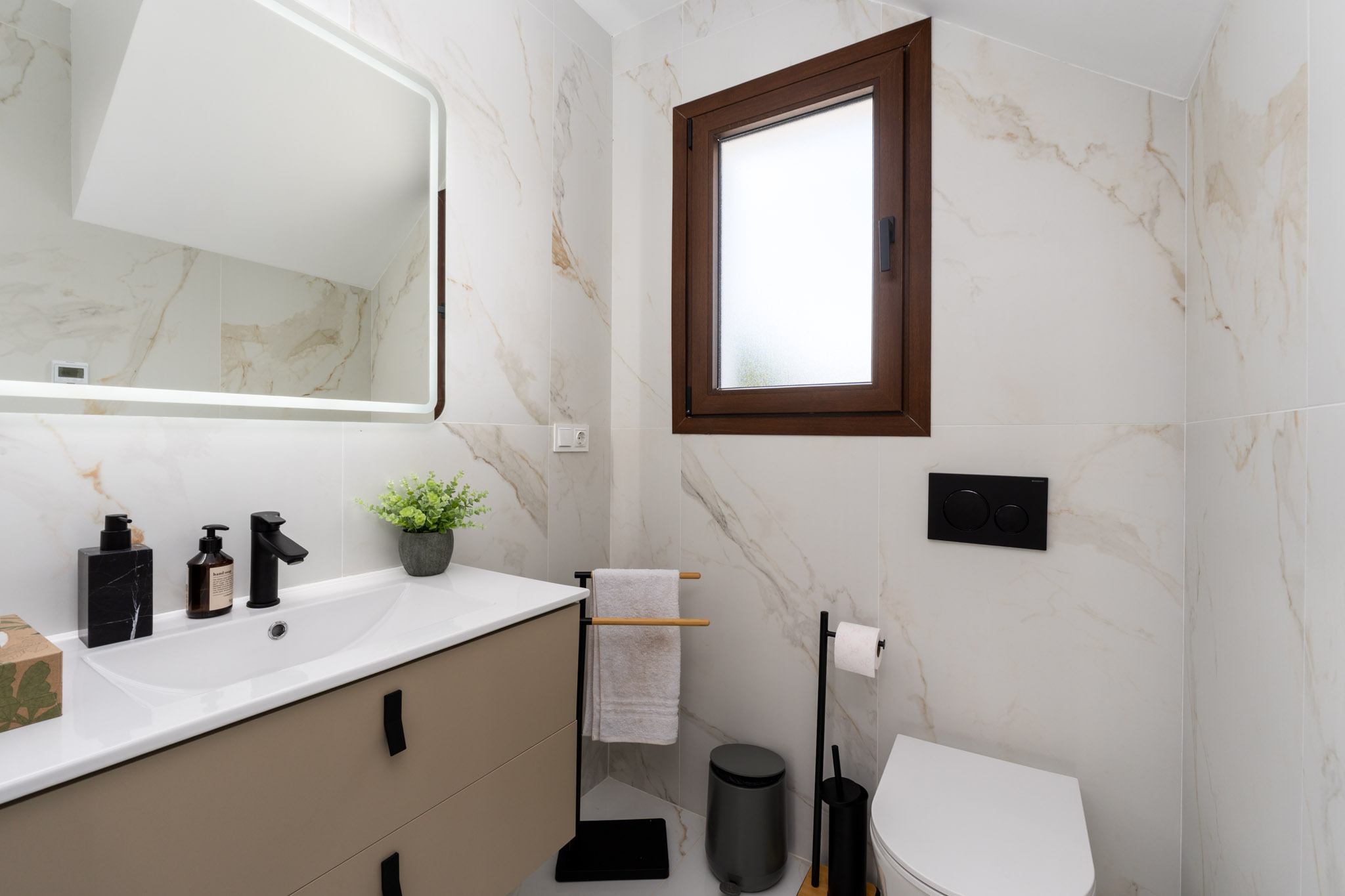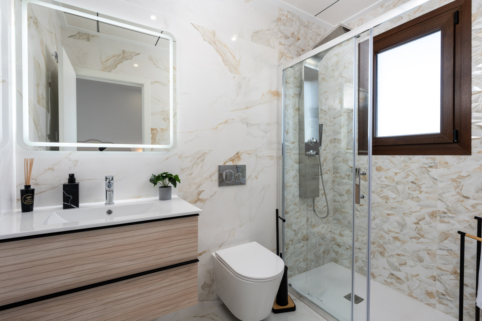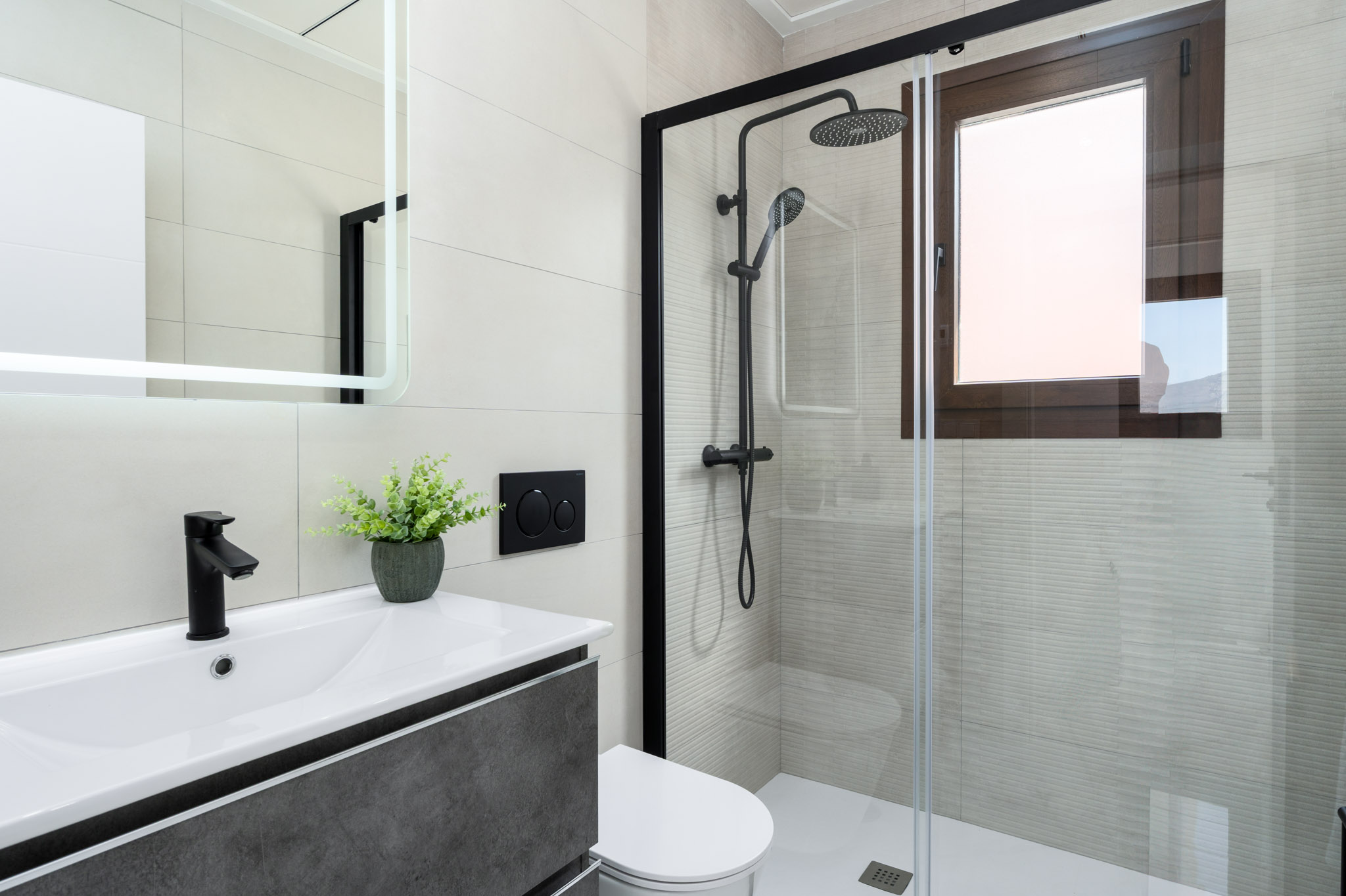 Designed with sustainability in mind, the property features an aerothermal system for hot water, three photovoltaic panels for energy production, and underfloor heating in all bathrooms. A ducted air conditioning system ensures yearround comfort. Inside, highquality porcelain floor tiles are used throughout, and nonslip ceramic tiles are applied in exterior areas for safety. The kitchen comes fully equipped with both high and low cabinets, along with a utility room for added convenience.