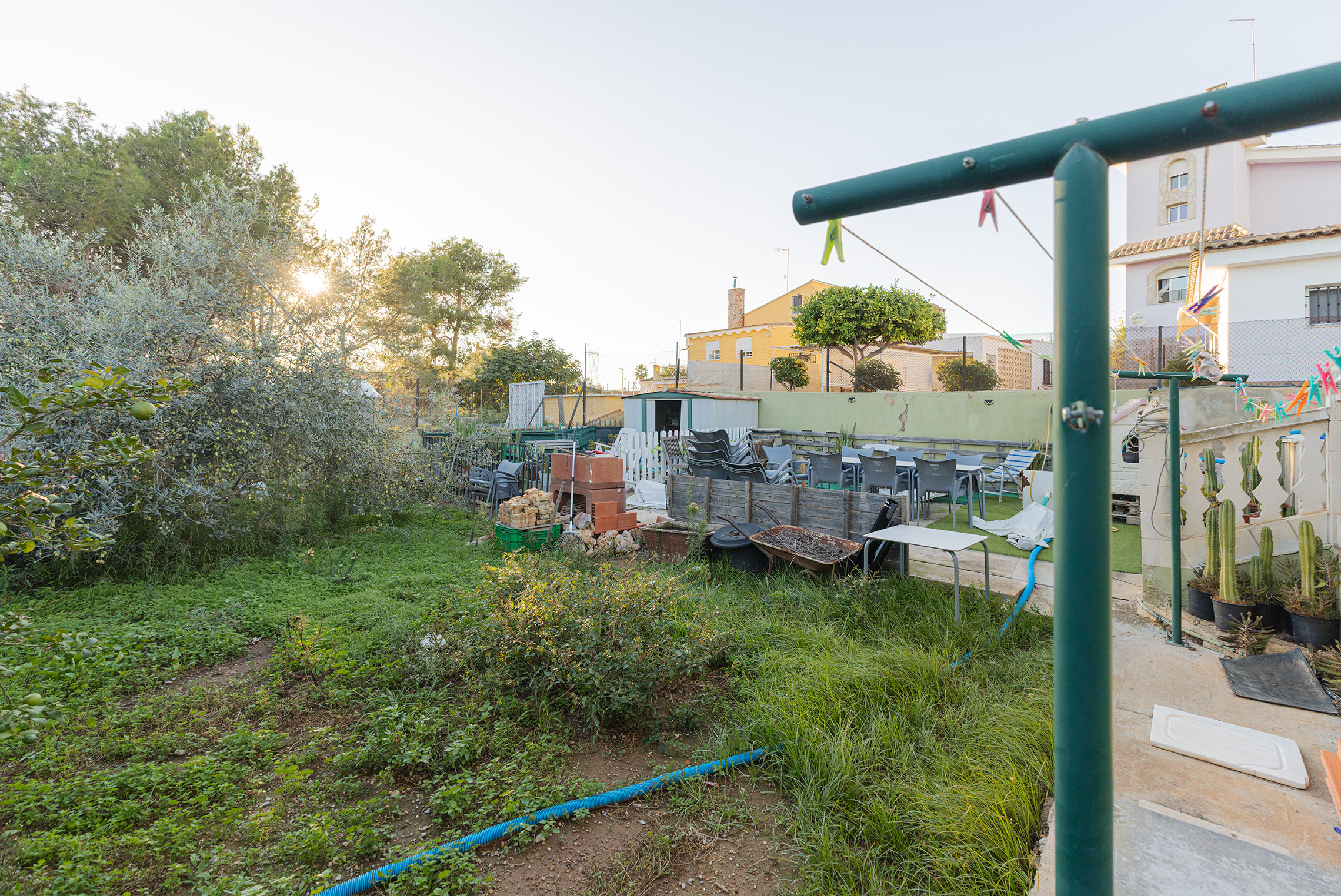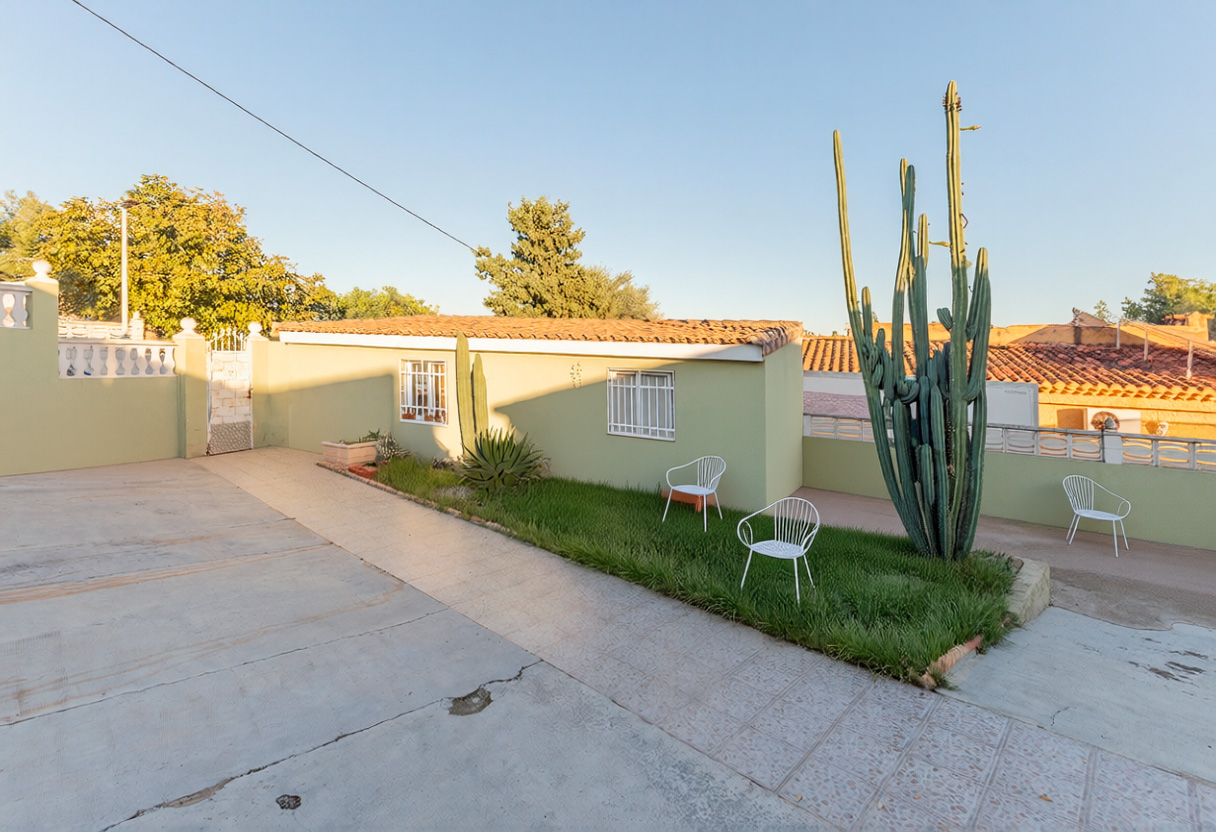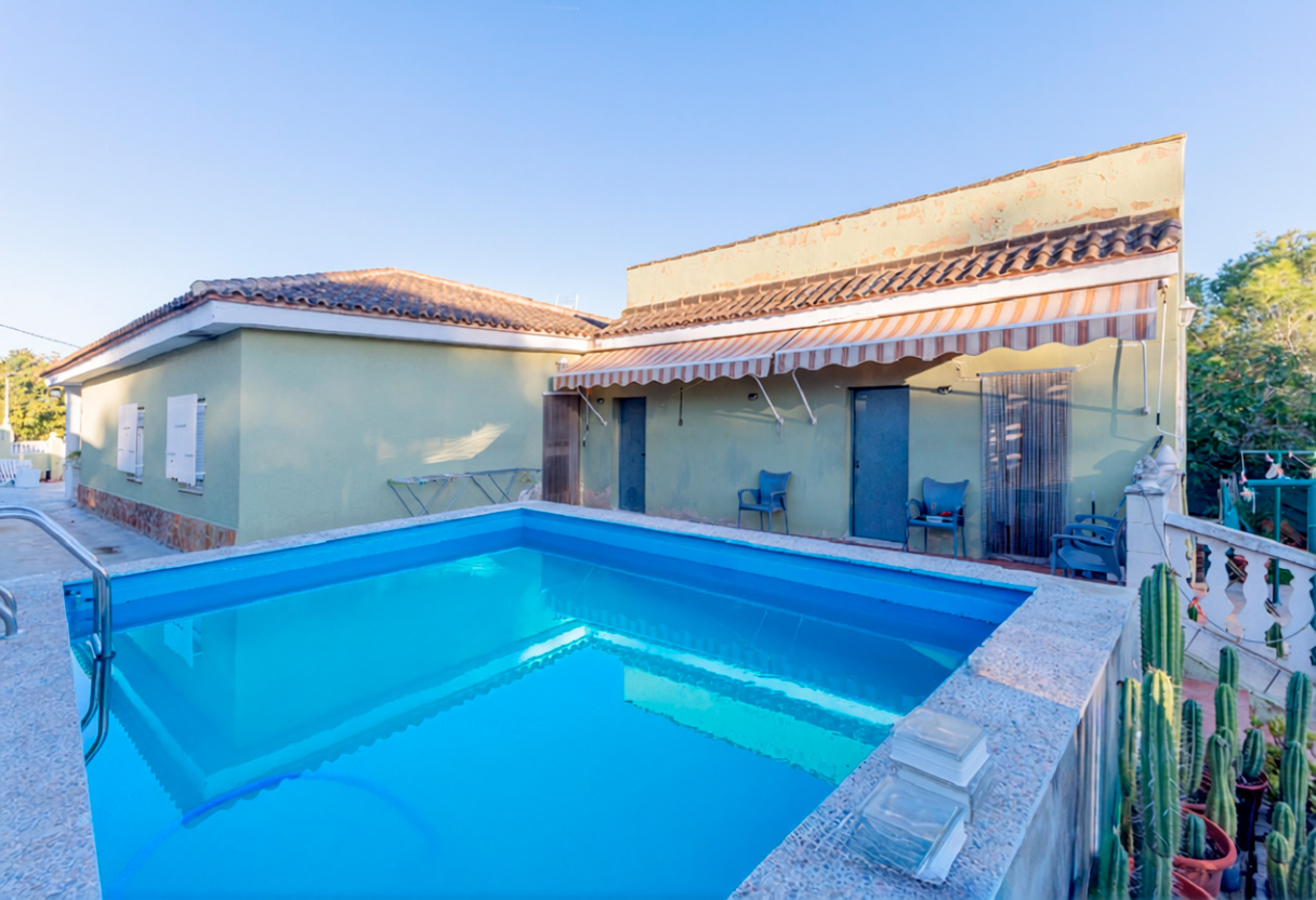 The house is distributed on a single floor and includes three double bedrooms, an independent kitchen, a living-dining room, and two full bathrooms, one of which is located outdoors. At the front of the property, there is a pleasant covered terrace, while at the back, next to the 17 m² swimming pool, you’ll find a convenient paellero area. The plot offers both pedestrian access and a separate entrance leading directly to the closed garage, which also includes a storage area.