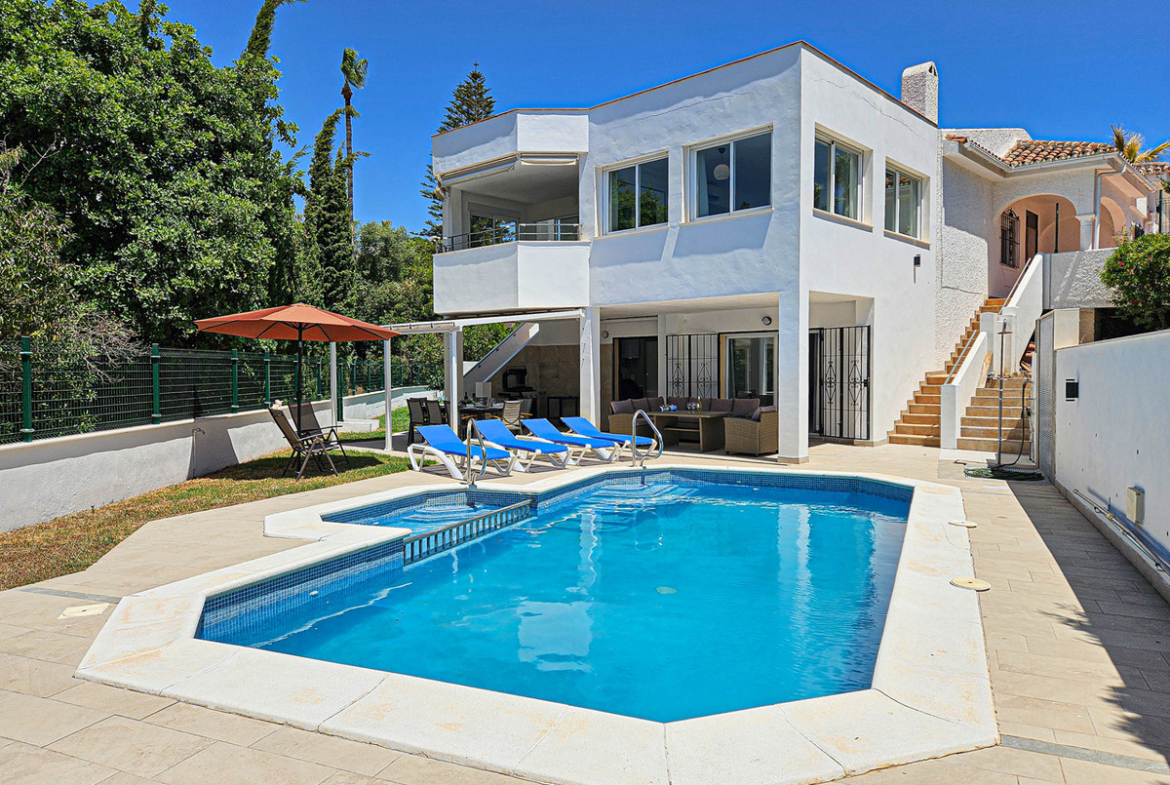 Villa for sale in , Mijas Costa with 4 bedrooms, 3 bathrooms, 1 toilet and with orientation south, with private swimming pool, private garage and private garden. Regarding property dimensions, it has 352 m² built and 775 m² plot. Has the following facilities amenities near, transport near, air conditioning, fully furnished, fully fitted kitchen, fireplace, barbecue, guest toilet, private terrace, living room, sea view, security shutters, smart home system, laundry room, internet - wi-fi, covered terrace, fitted wardrobes, garden view, street view, close to sea / beach, close to golf, open plan kitchen, balcony, good condition, close to shops, close to town and close to schools.