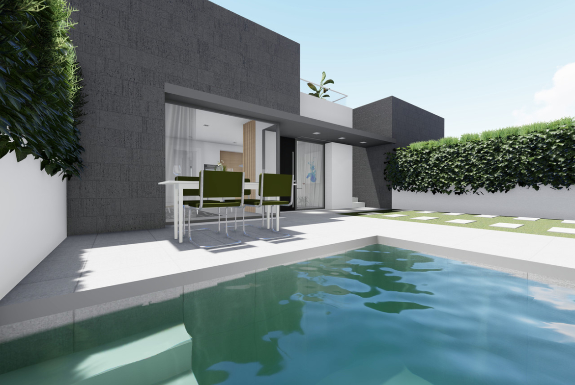 Private rectangular-shaped pool of 18.00 m2 (6x3m.) in the Villa Isla model and 6.00 m2(3x2m.) in the Villa Cala model. Depth of swimming pools between 1.20 and 1.50 m, formation of work steps. Equipped with skimmers, bottom drain, interior lighting, covered with top quality stoneware and will have a paved area attached to the porch of the house. Outside shower.