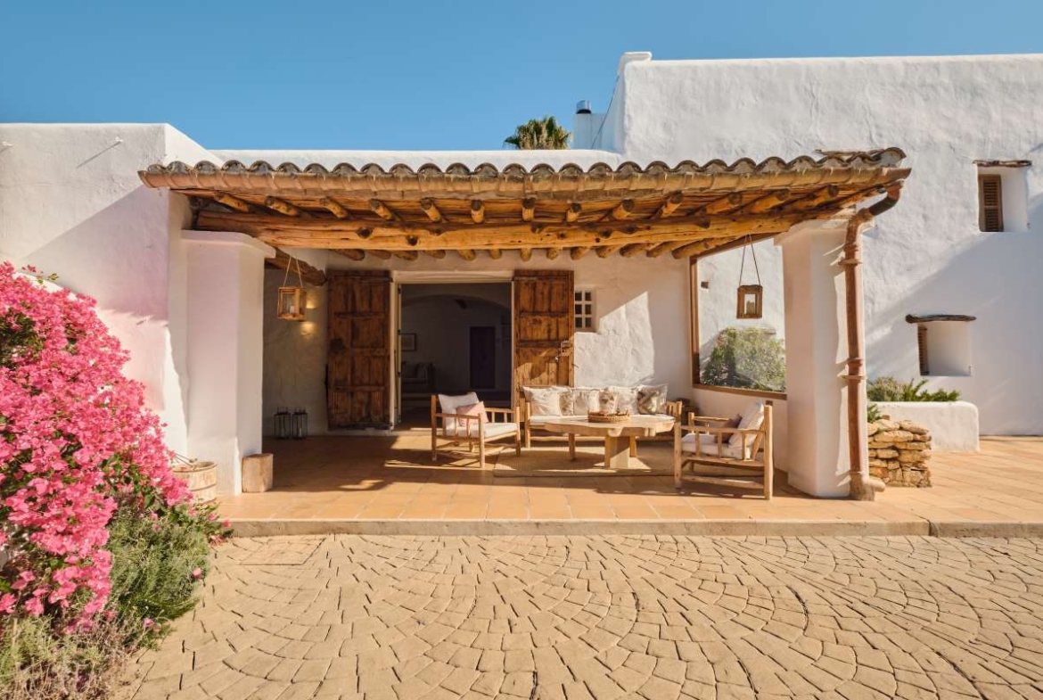 The surroundingsThis beautiful eco-friendly finca offers ultimate peace, space and privacy with an impressive amount of 7 bedrooms divided over the main house, including 4 independent guest houses. This villa is ideally located since it only takes 10 minutes to reach Ibiza Town, Santa Gertrudis and San Rafael. With these towns closeby, the property’s location offers easy access to all daily amenities including supermarkets, restaurants, bars, shops and schools. A wide array of beaches can be found within close proximity as well. Find the beautiful wide sandy beach of Talamanca on just a 10-minute drive or escape into nature at one of the many pristine beaches such as Cala Olivera, just 20 minutes away. This property faces south and offers expansive views of the countryside, perfect for a serene living experience. Due to the significant size of the property and its plot, this home is perfect for a large family who loves nature and is seeking tranquility while still being close to the hotspots of the island.The fincaThis exquisite renovated 7-bedroom finca is an authentic Balearic dream home. Originally built in 1532, the property combines rustic charm with modern luxury, situated on a plot of 3,336m2 with a total built area of 701m2. The main living area covers no less than 350m2 and welcomes you with a large enclosed porch that exudes atmosphere and comfort. On the ground floor you will find several areas, including the main living room on the right side of the main entrance. This room can be accessed through a separate door, which enhances privacy. This living room is very spacious, modern and offers a new, fully equipped kitchen and a cozy porch, in addition to a private ensuite bedroom. When walking straight ahead from the main entrance, you enter another elegant, open living room, which also serves as an inviting entrance hall. This space connects four suites, ideal as self-contained accommodations for your loved ones, family or friends. Further on, you will find a country kitchen and a separate dining room, which connects to the living room. The first independent suite is located on the ground floor and has its own entrance through a separate door. This suite includes two boho-chic bedrooms and one shared bathroom. Both bedrooms have access to the lush garden and pool area. On the first floor you will find the second suite, complete with its own living room and kitchenette. This bedroom has beautiful high ceilings with “sabina” wood beams and antique tile floors. The spacious ensuite bathroom is equipped with a bathtub and separate rain shower. From the bedroom you have direct access to a private terrace with breathtaking views of the surrounding nature and the swimming pool. The third and fourth suites are situated on the ground floor and each has a private entrance as well. Both feature a cozy living room, a fully equipped kitchen with dining area, and 1 or 2 bedrooms with a separate bathroom. Each guest house offers a private terrace with comfortable seating, both sunny and shady, for ultimate comfort and privacy for you and your guests. This breathtaking finca is not only beautiful but also environmentally friendly, thanks to 40 solar panels and two SolarEdge batteries that provide sustainable energy supply. The property is connected to the electricity grid, receives water from a neighbor's well and has two cisterns for rainwater harvesting. Each room has new Mitsubishi air conditioners for individual comfort, and the living room has a heat pump for both heating and cooling, supplemented by underfloor heating. For extra warmth, there is a wood-burning stove and two fireplaces. Finally, the finca has a separate laundry room for added convenience.The outdoor spacesThe exterior of this exquisite property is surrounded by stunning gardens and an open countryside that harmonize with the historic architecture of the original finca. A peaceful vegetable garden and parklike garden provide plenty of opportunities for outdoor activities to entertain adults, children and possible pets. The property also features a 60m2 swimming pool with an adjacent sun terrace, in addition to several outdoor seating areas, perfect for soaking up the Mediterranean sun or relaxing in the shade. The outdoor areas cover an impressive 115m2 of inviting terraces. An automatic garden irrigation system keeps the vegetation well hydrated and a perfectly planned lighting design enhances the beauty of the outdoor areas. Access to the property is largely via an asphalt road, with the final 400 meters on a scenic sandy road. Enter the property through an electric gate, ensuring both privacy and security. There is ample on-site parking, with parking space for up to five vehicles. This finca offers a perfect mix of Balearic authenticity, bohemian chic charm and modern convenience, all within close proximity to the island’s hotspots.