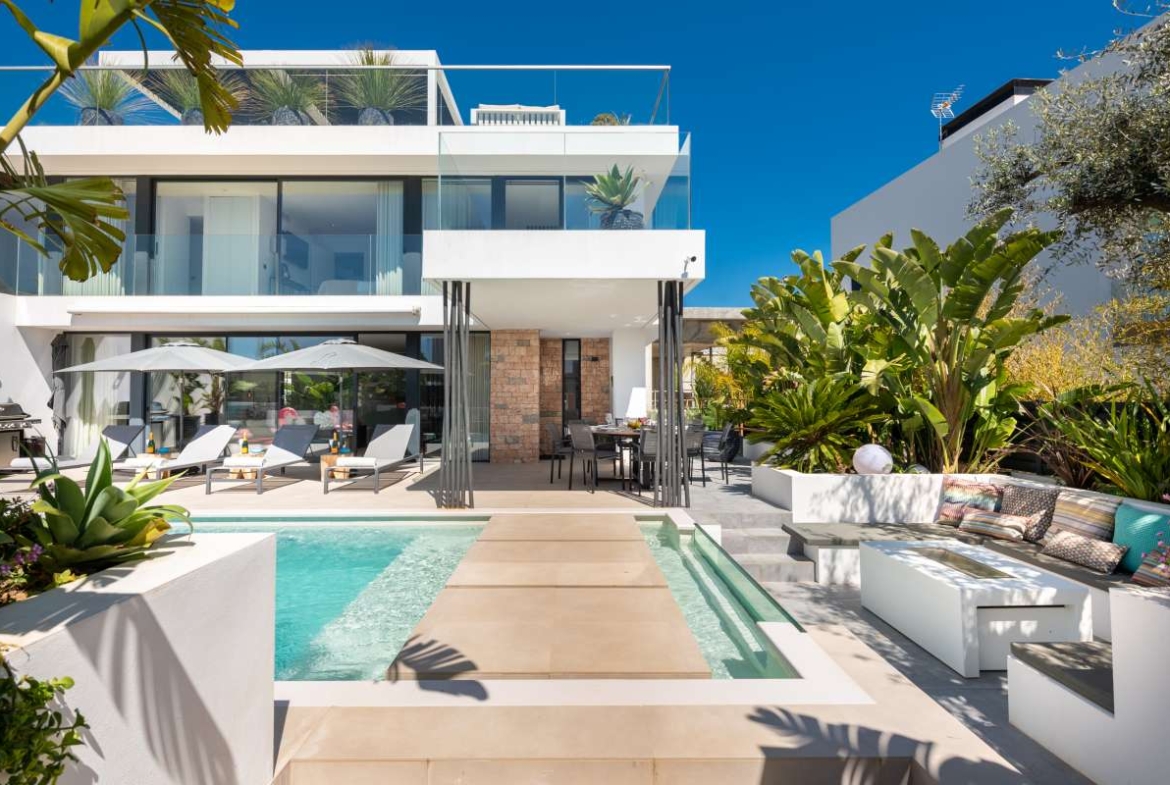 The surroundings This luxury villa in Ses Torres is located within walking distance of the bay of Talamaca. From this small-scale urbanization it is possible to walk to the beach or to the lovely village of Jesús. Here you will find several restaurants, supermarkets and nice shops. In less than fifteen minutes you are in Ibiza Town where you can enjoy the vibrant life. Finally, the golf course of Ibiza is a very close by from the spacious villa. The villa There are few villas where literally everything seems to be right, this is one of them. This exceptional residence really let nothing to be desired. The appearance of the villa is modern, fashionable and cozy at the same time and exudes the Ibiza Bohemian atmosphere. It facilitates 6 spacious bedrooms, each with an elegant bathroom ‘en suite’. The stylish, spacious living room adjoins the open kitchen, between which a large table has been placed where people can eat with at least eight people. The prestigious kitchen is equipped in timeless white with high-end built-in appliances and has a handle-free finish. Behind semi-permeable glass, the floating staircase can be seen, which creates a special, extra atmosphere in the villa. This residence also has a spectacular gym where high-quality equipment has been chosen. There is also an impressive club where you can enjoy various refreshments. To enjoy these, you can choose to take a seat at the luxurious marble bar or at one of the exclusive tables surrounding it. There are four different music zones in the house that are controlled by the Sonos system. You can enjoy your favorite music in the club, around the pool, in the living room and on the roof terrace. The outdoor spaces You will be taken outside through large glass sliding doors. What immediately stands out is the beautiful swimming pool. This is built in the length of the villa and has a glass wall that serves as the edge of the swimming pool. There are different types of comfortable sunbeds and lounge sets around, so that you can relax optimally. There is also a jacuzzi for an optimal experience. On top of the roof of the property is an amazing kitchen that is fully equipped. Just like downstairs, there is a spacious table that is completely shaded by a beautiful canopy. The view is astonishing: you overlook the beauty of Dalt Vila. The delivery includes all furniture and accessories. The garden and the plants on the roof terrace are watered by an automated irrigation system. Finally, the house is equipped with an advanced camera system outside and an alarm system inside.