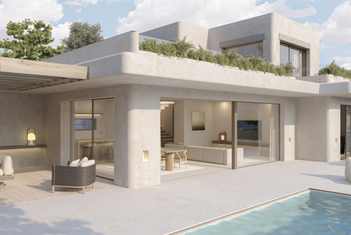 Discover these impressive villas under construction located in one of the most sought-after areas of the Spanish Costa Blanca! Situated between Pinar del Advocat and Benimeit, in the charming coastal town of Moraira, these properties are just 2.5 km from the beaches, the old town, the fishing port, and the prestigious Club Náutico. The impeccable and timeless style of the exclusive “Moraira Natura” development is sure to captivate you. This ambitious project has been executed with top-quality materials and consists of only 6 units, offering a private atmosphere amidst lush nature and the most refined Mediterranean architectural elegance. Each villa is set on plots ranging from approximately 888.14 m2 to 1,144,80 m2 and is distributed over 2 open-plan floors, making the most of natural light and the connection between indoor and outdoor spaces. On the ground floor, you will find the resting area with 2 bedrooms, each with its own en-suite bathroom and separate dressing room. On the upper floor, you will enter the villa to discover the day area, which includes a bright living-dining room, a fully equipped minimalist kitchen with a cooking island and a breakfast bar, a guest toilet, and a master bedroom with an en-suite bathroom and dressing room. Additionally, this floor offers a beautiful outdoor space clad in natural stone, featuring an exquisite landscaped garden, a pool, and several relaxation areas to enjoy the warm Costa Blanca climate. Among the additional extras are a garage for 2 vehicles, an elegant oak-toned wooden pergola on the terrace, an outdoor toilet, centralized air conditioning, underfloor heating, a security door, an alarm system, home automation, and custom-built wardrobes, among others. These properties represent a unique opportunity to live in luxury and comfort in an unparalleled setting on the Costa Blanca, with prices ranging from €1,690,000 to €1,750,000. Don’t miss this opportunity!