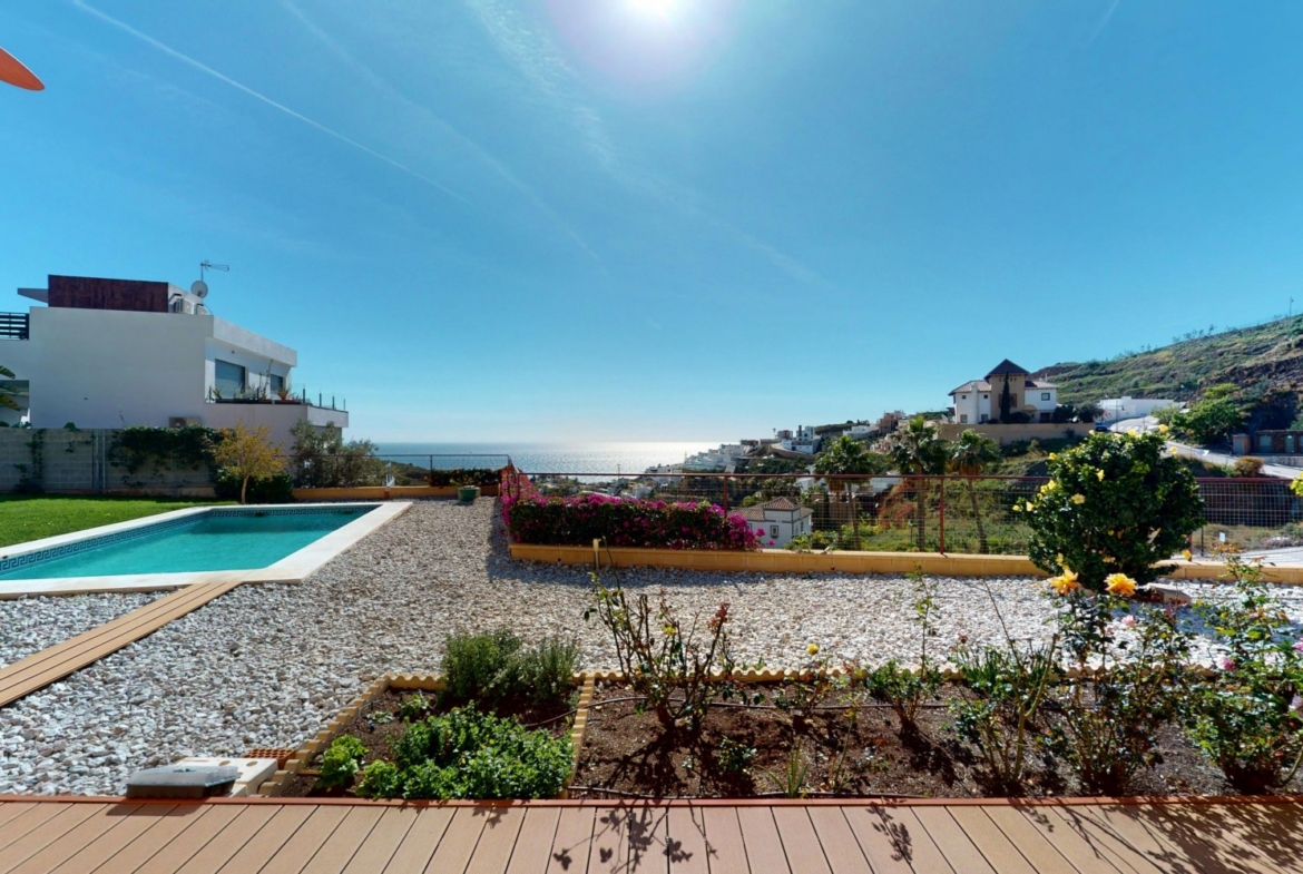 This luxurious Mediterranean villa in Torrox, Málaga, is spread across two floors and offers breathtaking sea views. The property is designed with sustainability in mind and is a true zero-energy home, maintaining a comfortable temperature year-round thanks to its high-quality insulation and comfort ventilation system. Solar panels further enhance its energy efficiency. The main floor features an open-plan living area with a sleek and modern kitchen, equipped with light-colored cabinetry and integrated appliances. The spacious living room is bright and airy, seamlessly blending indoor and outdoor spaces through large glass doors that open onto a sun-drenched terrace. This terrace offers stunning panoramic views of the sea and surrounding landscape and includes a private swimming pool, making it an ideal spot for al fresco dining and relaxation. The villa boasts three well-appointed bedrooms, including a master suite with an en-suite bathroom. The additional two bedrooms share a stylishly designed bathroom with contemporary fixtures, such as walk-in showers and floating vanities. An office space with built-in storage provides a dedicated area for work or study. A standout feature of the home is its accessibility. A lift connects both floors, ensuring comfort and convenience for all residents. The villa also includes ample storage solutions, with built-in wardrobes in the bedrooms and additional organized spaces throughout the house. Outside, the landscaped garden enhances the Mediterranean ambiance, offering a serene retreat. A carport provides secure parking. The property sits on two building plots, offering the possibility to construct additional structures if desired. Designed by the current owner, this villa incorporates unique architectural elements and thoughtful details that set it apart. Combining Mediterranean charm with modern sustainability, this home is a perfect sanctuary in the heart of the Costa del Sol. We are pleased to be able to present this dream property to you soon, either personally or via virtual viewing. Because this world is unique - just like our Axarquía. In Andalusia. On the Costa del Sol. Here, on the sunny side of life...
