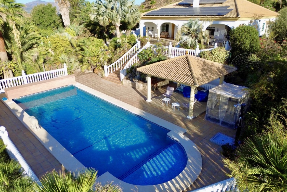 This charming villa in Vélez-Málaga combines comfort, spaciousness and a design that integrates tradition and modernity. The property has three bedrooms and two bathrooms, and an open-plan design that seamlessly connects the living room, dining room and kitchen, creating a bright and welcoming atmosphere. The living room has a cozy fireplace with a wooden mantel, perfect for cooler nights, and large windows that flood the house with natural light and offer views of the surroundings. The modern kitchen is equipped with stylish cabinets, granite countertops and stainless steel appliances, including gas hob and extractor hood. The villa has an office space and a decoration that combines contemporary and traditional elements, with artistic details that add colour and personality to the rooms. Outside, the property stands out for its large plot full of various fruit trees, including exotic fruits, as well as a small greenhouse and a storage room. The house has a carport, private pool with underwater speakers and counter-current swimming system, chill out area and on the terrace a barbecue area, perfect for enjoying outdoor meals while contemplating spectacular views of the sea and the mountains. This villa represents a unique opportunity for those looking for a home with charm, comfort and ample amenities in the beautiful region of Malaga.   We are delighted to be able to present this property to you soon, either personally or via virtual viewing. Because this world is unique - like our Axarquía. In Andalusia. On the Costa del Sol. Here, on the sunny side of life...